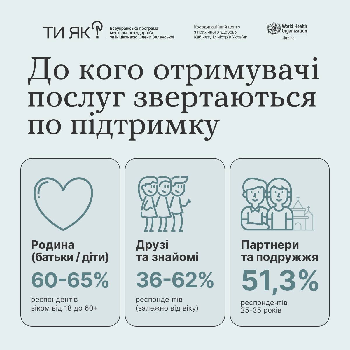 👨👩👧👧 Для 65% отримувачів послуг головним джерелом підтримки залишається родина. Далі за значущістю йдуть друзі та знайомі, а також партнери й подружжя, однак роль цих зв’язків помітно змінюється з віком. Уже серед підлітків кожен четвертий намагається впоратися з проблемами самостійно. А для людей старшого віку зростає значення церкви, тоді як роль дружніх і партнерських стосунків поступово зменшується.