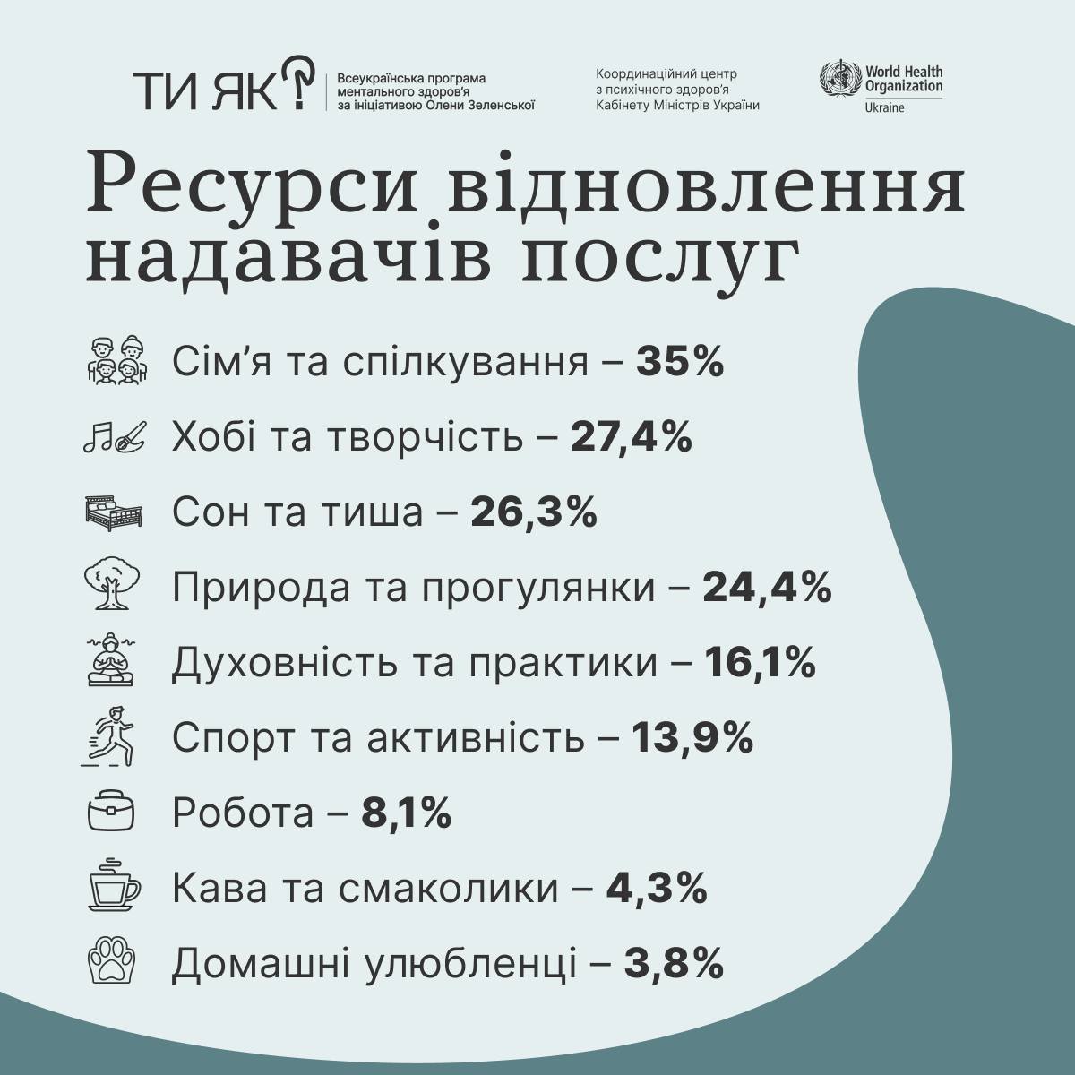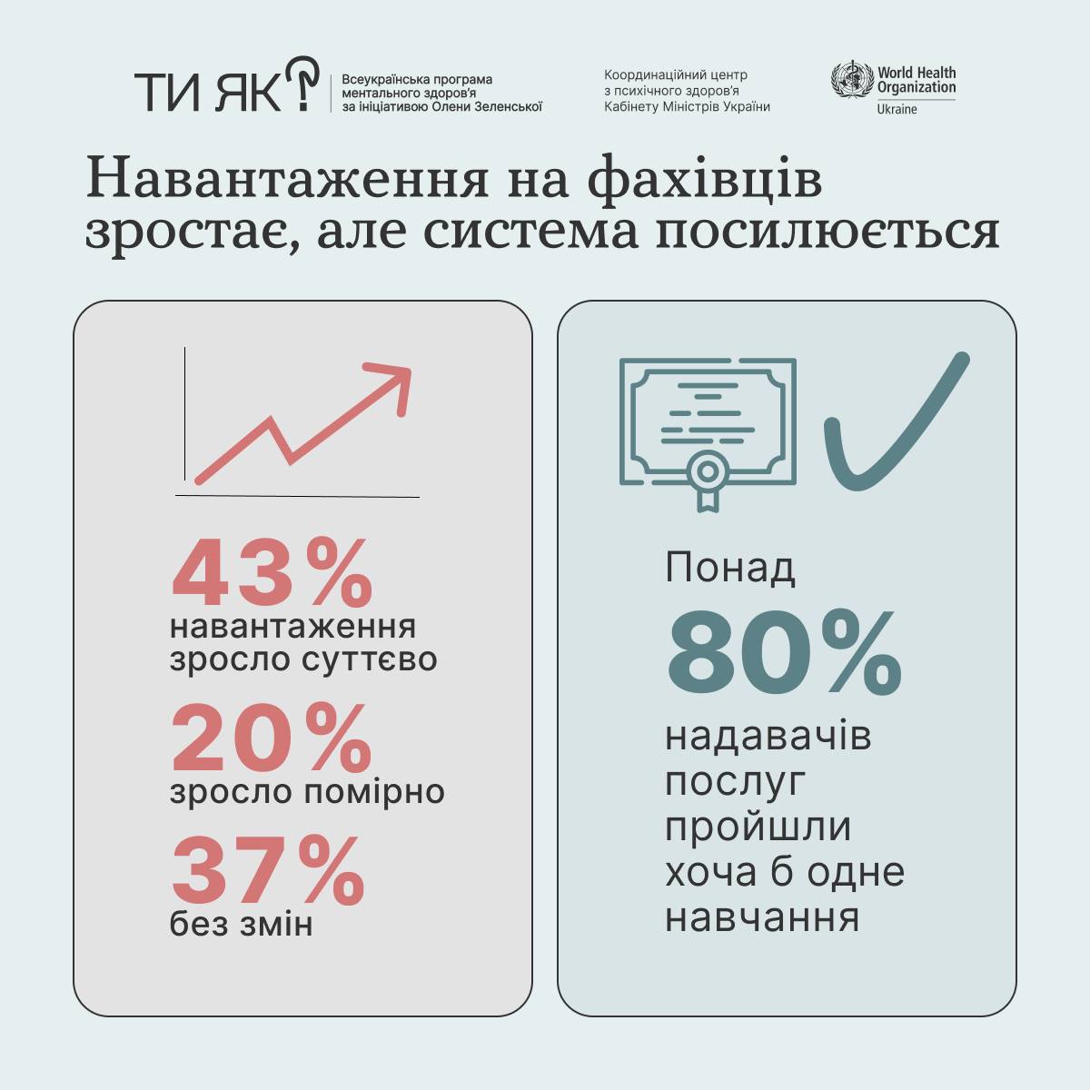 ℹ️ Супровід розробки та впровадження Всеукраїнської програми ментального здоров’я Ти як? – ініціативи першої леді Олена Зеленська – здійснює Координаційний центр КМУ / Mental Health UA за експертної підтримки Всесвітньої організації охорони здоров’я World Health Organization (WHO).