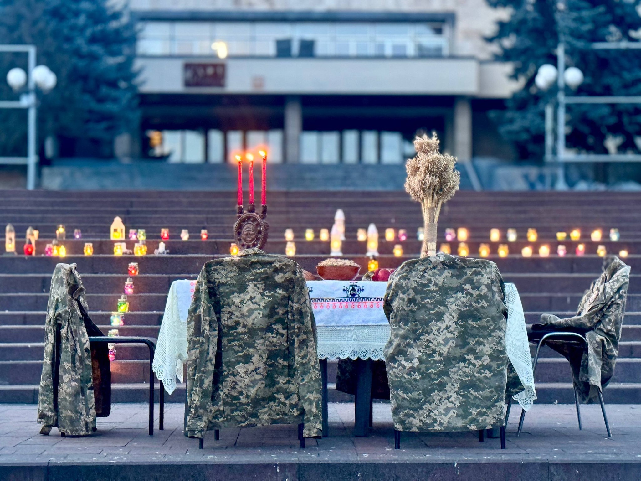 На площі поставили стіл з традиційною кутею і кителі військових, як знак пам’яті, знак очікування, мовчазне свідчення того, що за цими столами є місце для тих, хто має повернутися.