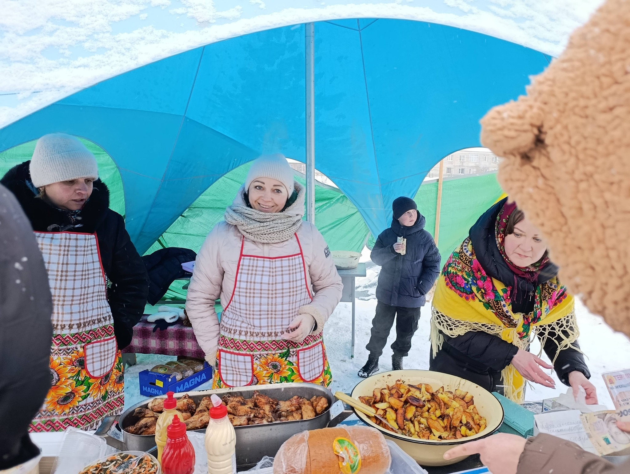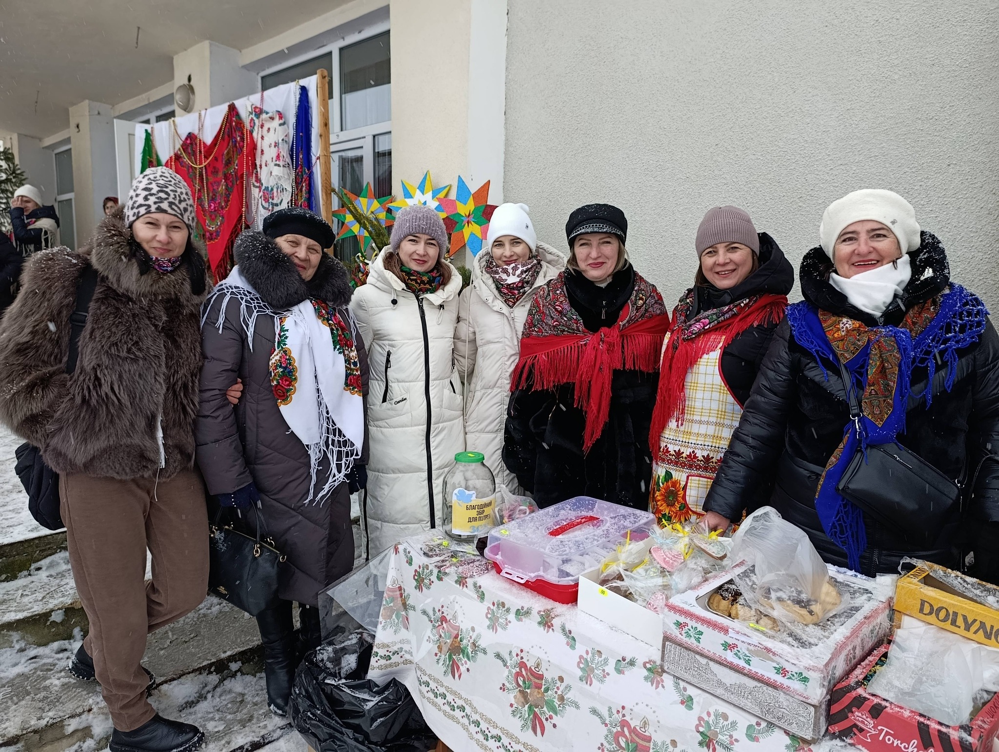 🍰🍲🍡Поруч зі сценою життя вирувало не менш активно. Працювала польова кухня: смажили картоплю та м’ясо, пригощали гарячим чаєм, глінтвейном і бограчем. Особливо смакував бограч, приготований волонтеркою Христиною Шабат. Неподалік діяв благодійний ярмарок — із солодощами, різдвяними сувенірами та виробами ручної роботи. Свою продукцію представляли працівниці КЗ “Публічна опорна бібліотека ім. Івана Тиктора”, відділу освіти громади та активні волонтери. Також смачні смаколики на ярмарок передали завідувачі Народних домів Красненської громади, за що їм щира подяка. Поки жінки ярмаркували, чоловіки підкидали дрова у вогнище, смажили картоплю й шашлики — кожен долучався до спільної справи.