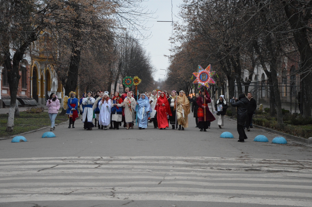 У такій реальності — між сиренами та тривогами, колядники пройшли вулицею Театральною до театру імені Марка Кропивницького, наповнюючи простір різдвяними піснеспівами.