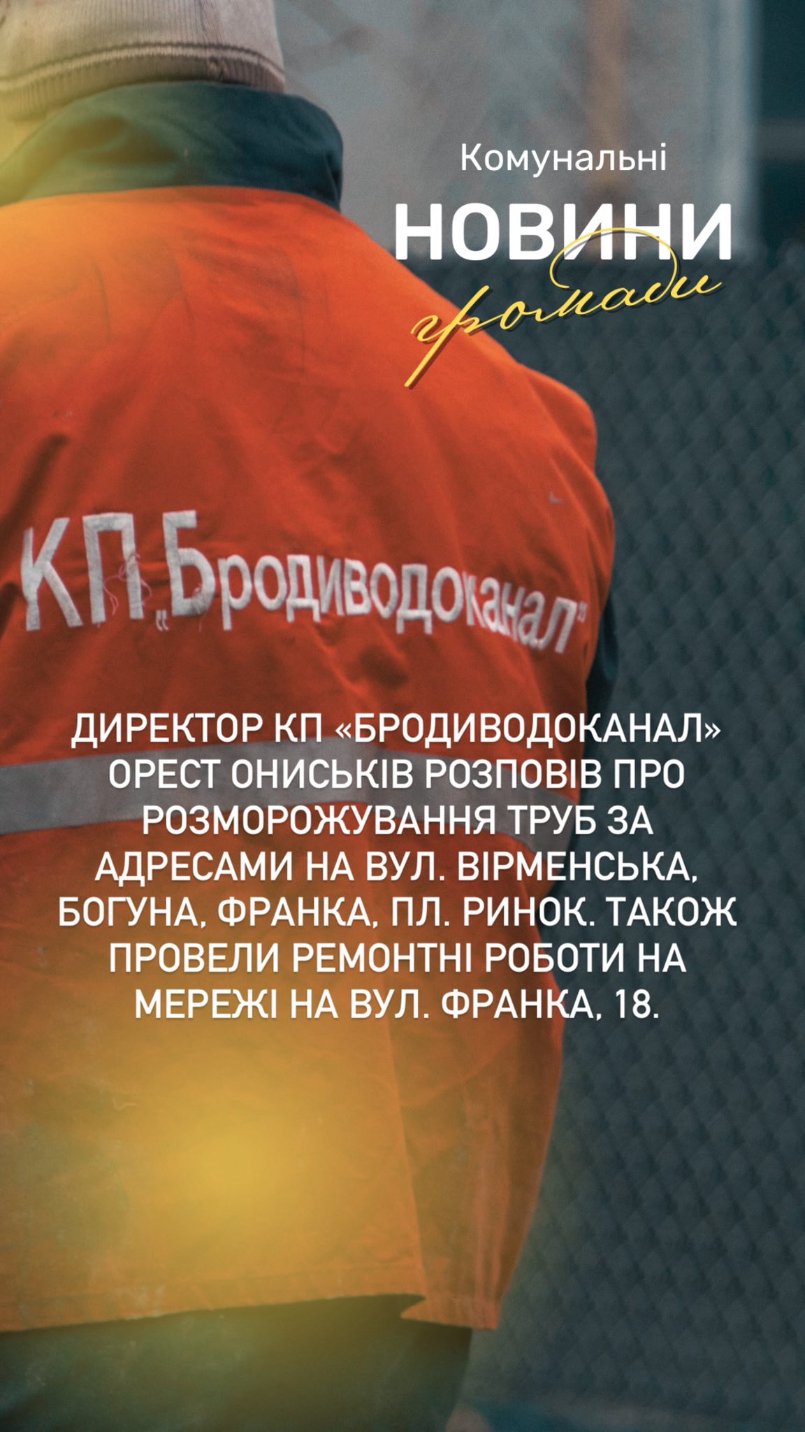 🔵Директор КП «Бродиводоканал» Орест Ониськів розповів про розморожування труб за адресами на вул. Вірменська, Богуна, Франка, пл. Ринок. Також провели ремонтні роботи на мережі на вул. Франка, 18.