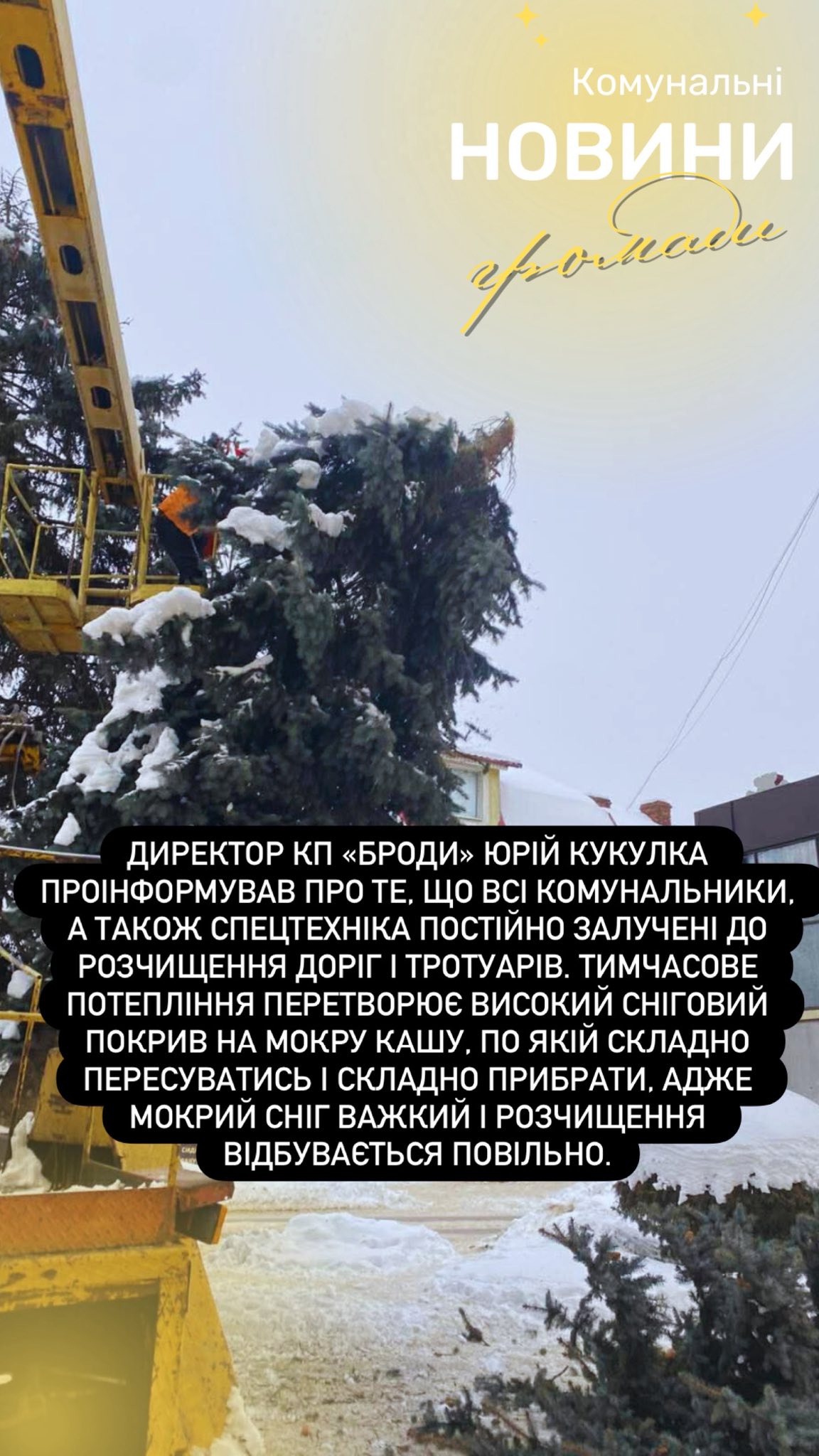 🔵 Директор КП «Броди» Юрій Кукулка проінформував про те, що всі комунальники, а також спецтехніка постійно залучені до розчищення доріг і тротуарів. Тимчасове потепління перетворює високий сніговий покрив на мокру кашу, по якій складно пересуватись і складно прибрати, адже мокрий сніг важкий і розчищення відбувається повільно.