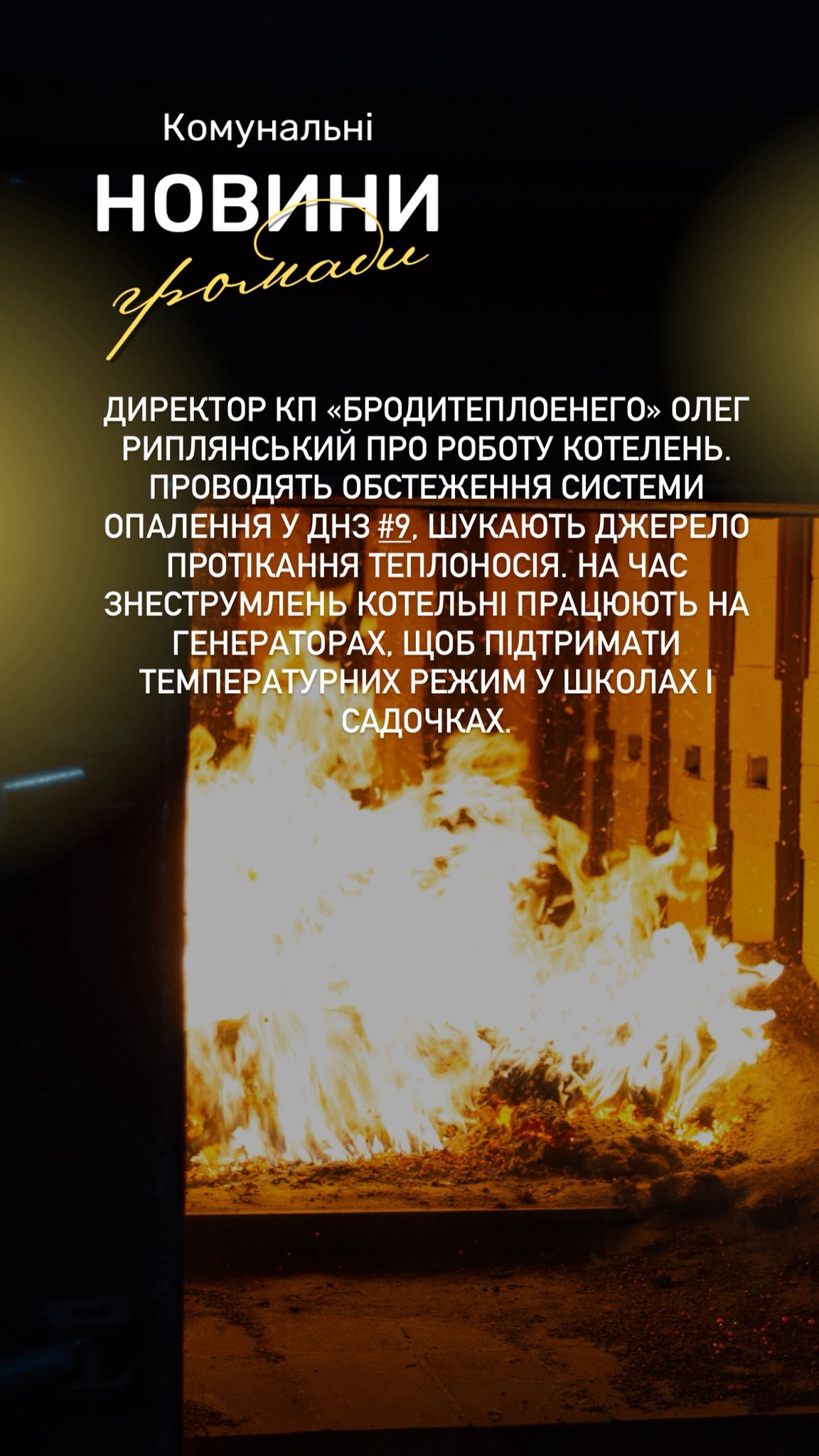 🔵Директор КП «Бродитеплоенего» Олег Риплянський про роботу котелень. Проводять обстеження системи опалення у ДНЗ #9, шукають джерело протікання теплоносія. На час знеструмлень котельні працюють на генераторах, щоб підтримати температурних режим у школах і садочках.