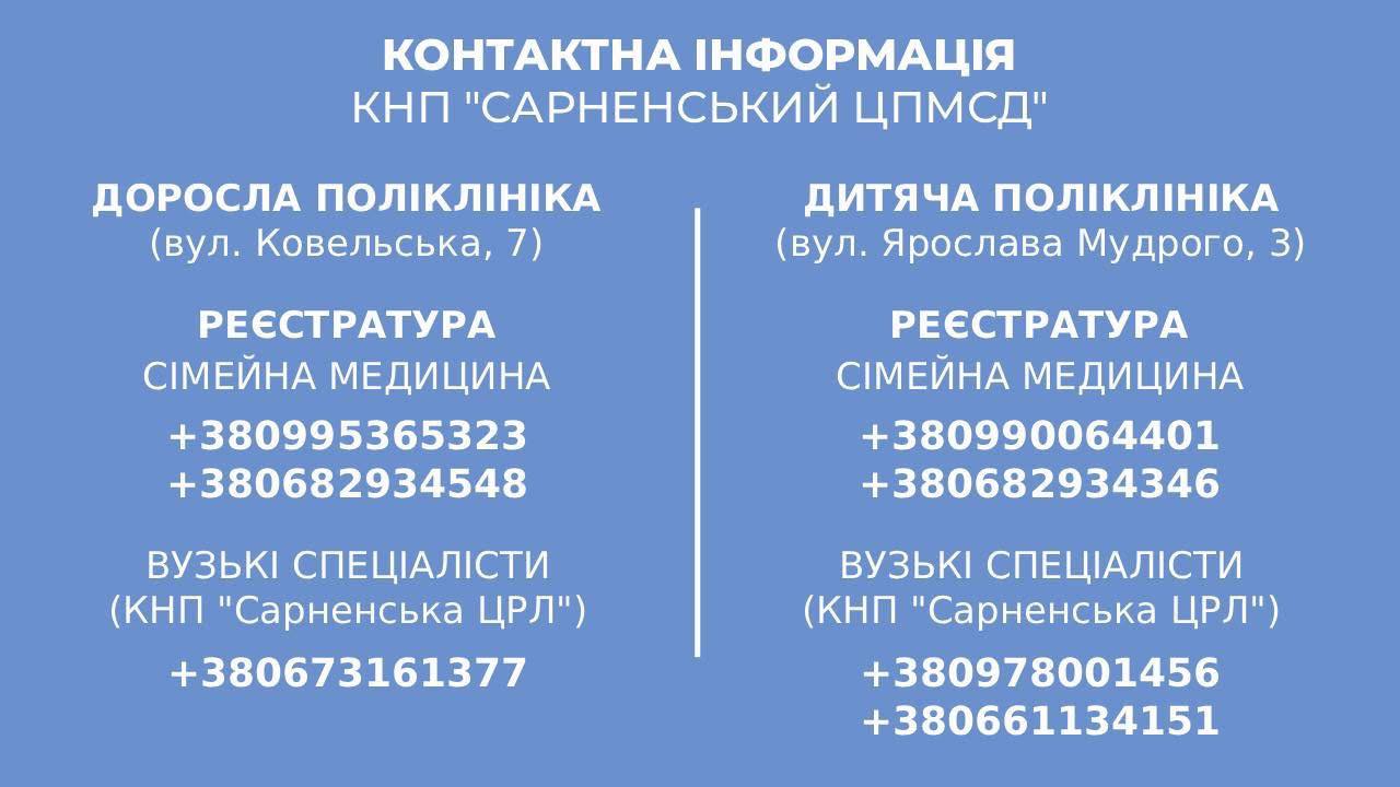 ☎️ Контактна інформація КНП «Сарненський ЦПМСД»