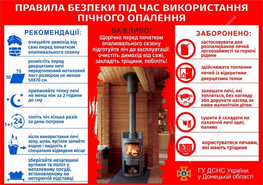 ❌ залишати печі, які топляться, без нагляду або доручати нагляд за ними малолітнім дітям; користуватися печами, які мають тріщини; розміщувати паливо, інші горючі речовини та матеріали безпосередньо перед топковим отвором;