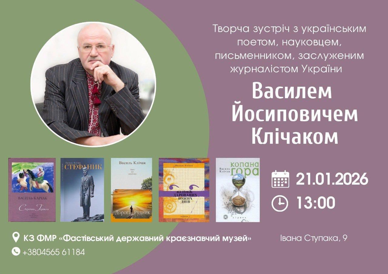 Краєзнавчий музей запрошує на творчу зустріч з українським поетом, науковцем, письменником, заслуженим журналістом України Василем Йосиповичем Клічаком.