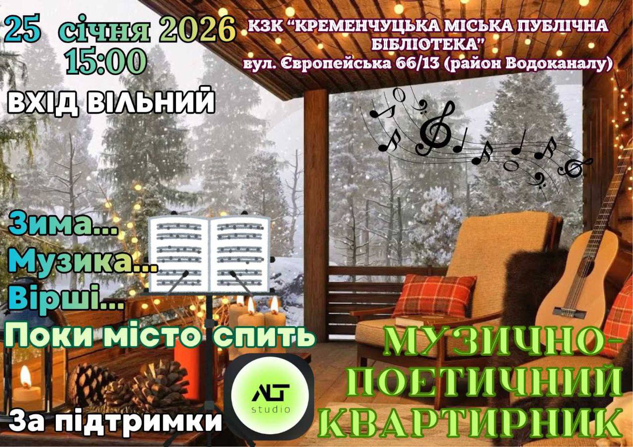 🎶 Кременчуцька міська публічна бібліотека запрошує на музично-поетичний квартирник «Зима… Музика… Вірші… Поки місто спить».