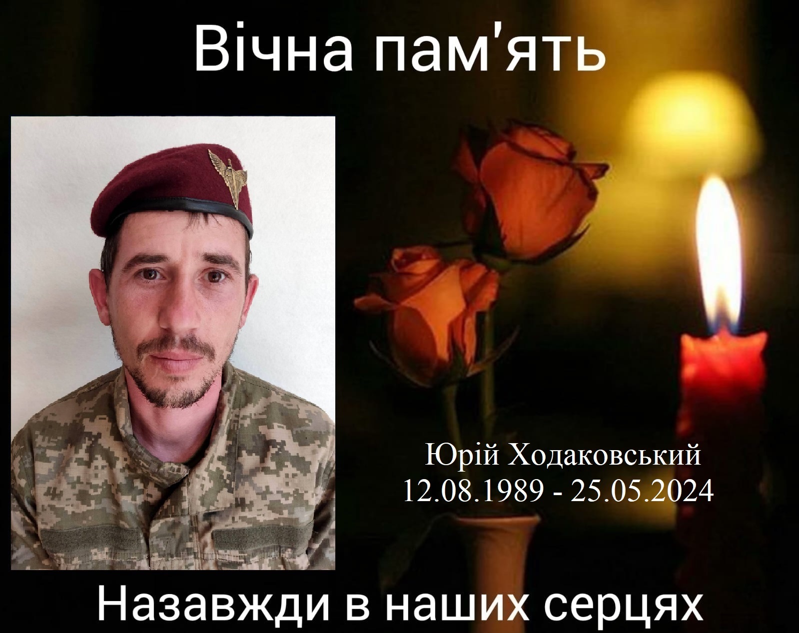 Солдат Юрій Ходаковський, 1989 року народження, стрілець десантно-штурмового відділення, прийняв свій останній бій 25 травня 2024 року в районі села Новомихайлівка, Покровського району, Донецької області.