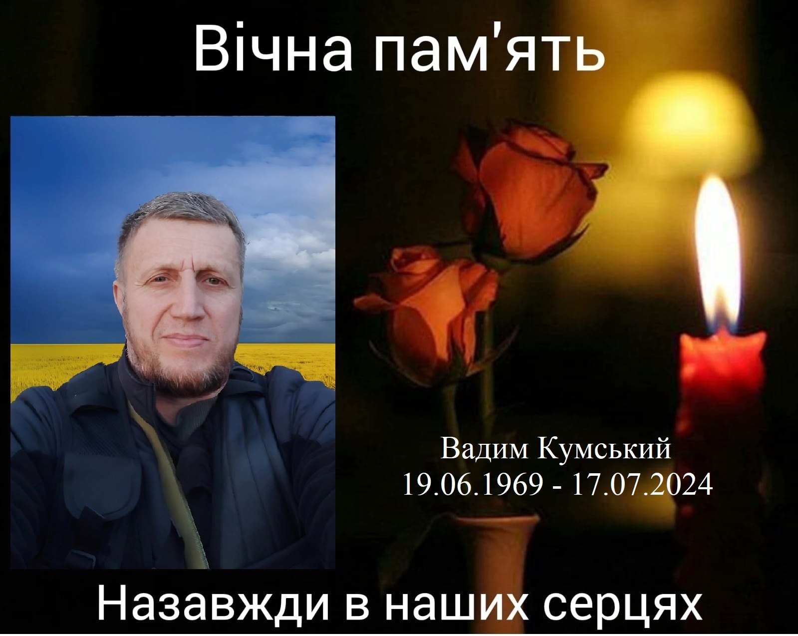 Солдат Вадим Кумський, 1969 року народження, стрілець-снайпер, загинув 17 липня 2024 року, захищаючи населений пункт Невельське, Покровського району, Донецької області.