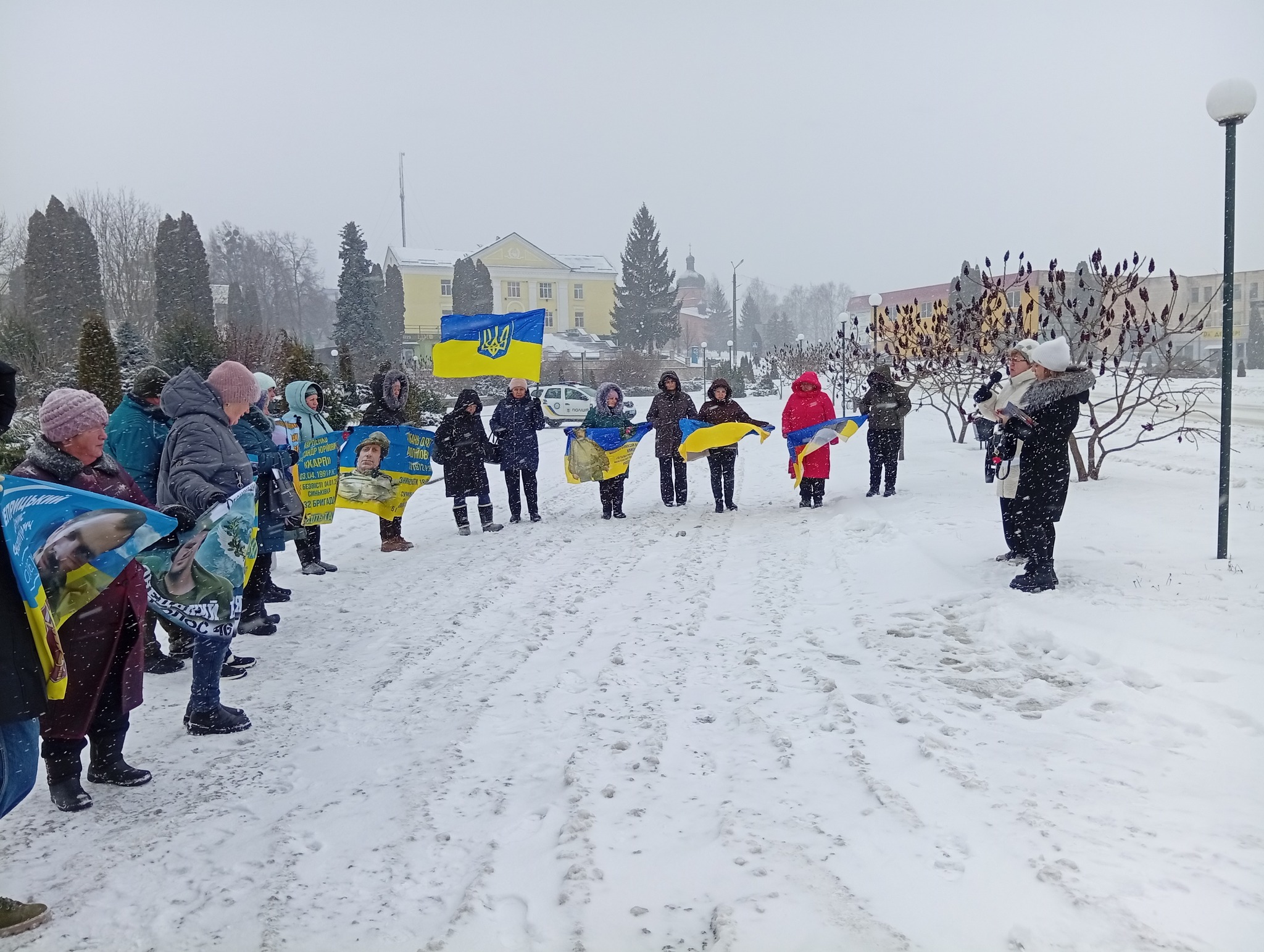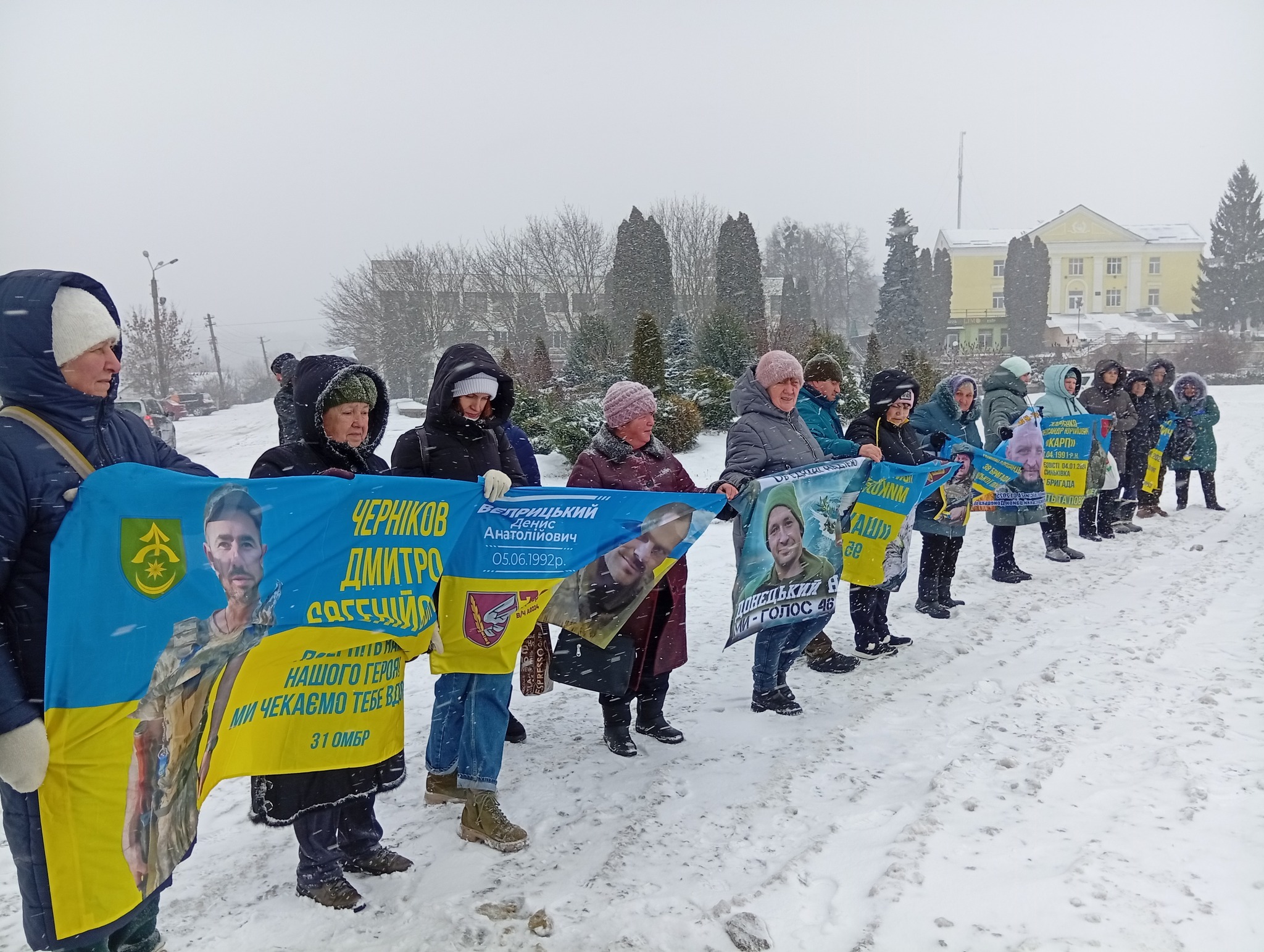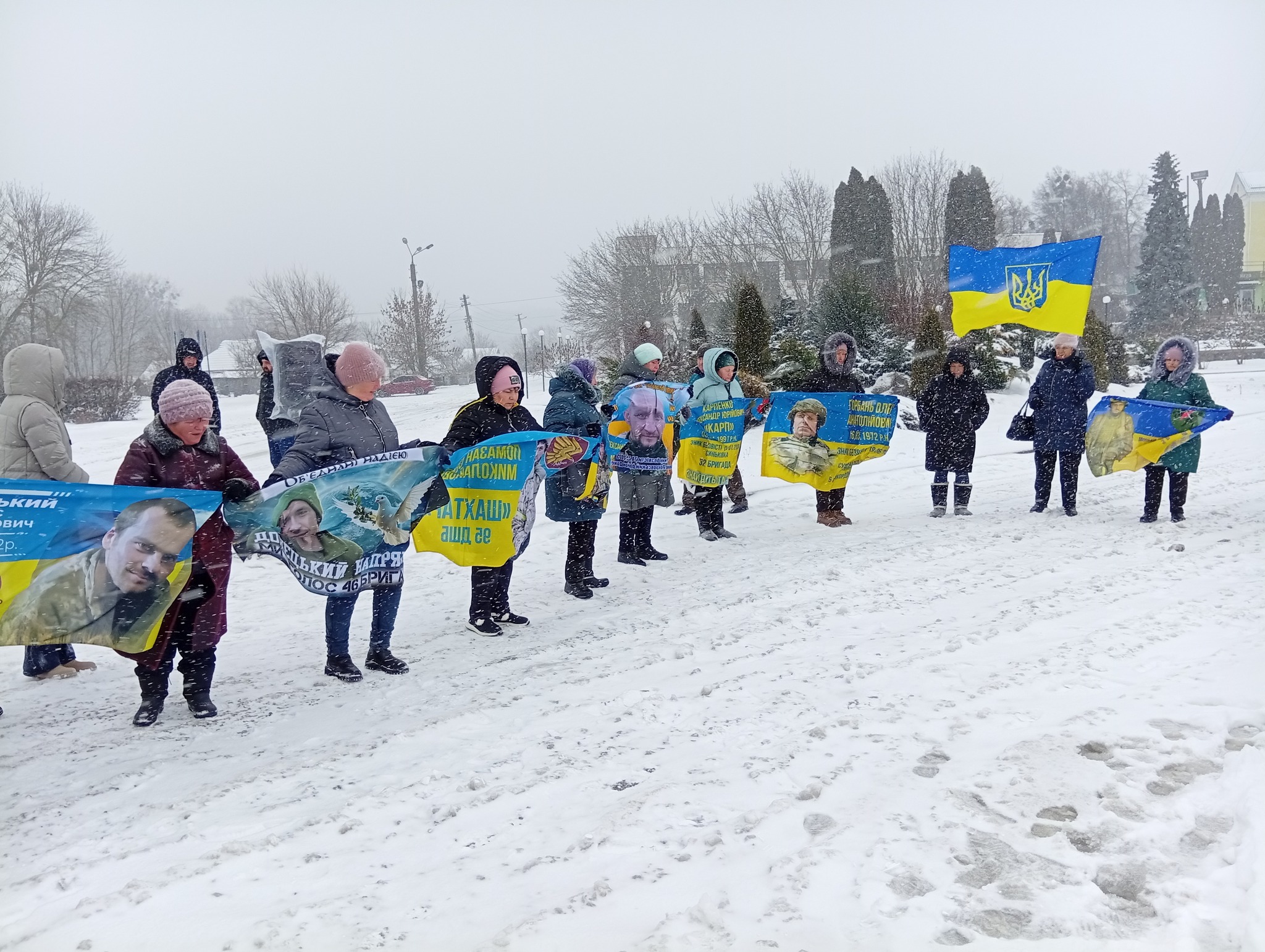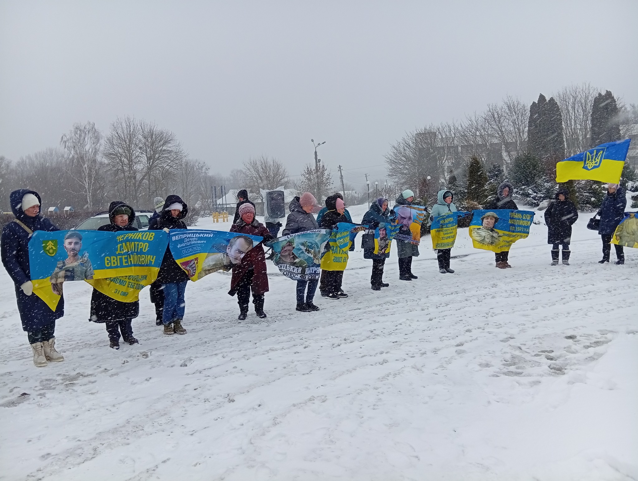 Сьогодні, у засніженому центрі селища Липова Долина, відбулася чергова мирна акція на підтримку безвісти зниклих та військовополонених Захисників і Захисниць України.
