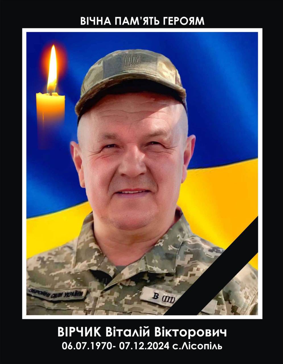 ▪️Віталій Вікторович Вірчик, народжений у 1970 році, мешкав у селі Лісопіль. У травні 2022 року його було призвано на військову службу, де він обіймав посаду водія-електрика 1-ї стрілецької роти. Він трагічно загинув 7 грудня 2024 року під час виконання бойового завдання. До останнього моменту Віталій Вікторович залишався вірний військовій присязі, віддано захищаючи рідну землю та наше спільне майбутнє. Він похований на Костопільському міському кладовищі “Нове”.