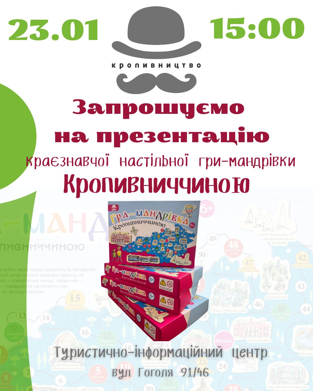 Туристично-інформаційний центр міста Кропивницького та Видавництво “Кропивництво” запрошують кропивничан на презентацію гри – блукалки «Мандрівка КРОПИВНИЧЧИНОЮ».