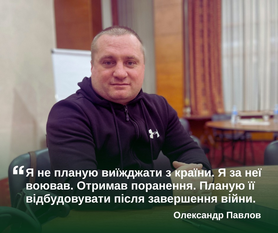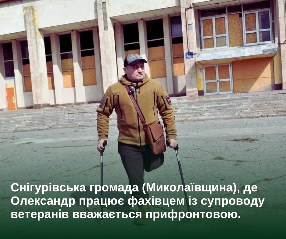 💬 Мене звати Олександр Павлов. 44 роки. Я – ветеран, людина з інвалідністю другої групи. Важке поранення (і як наслідок ампутація нижньої кінцівки) отримав на бойових. Уже рік працюю фахівцем із супроводу ветеранів у Снігурівській громаді, що на Миколаївщині”.