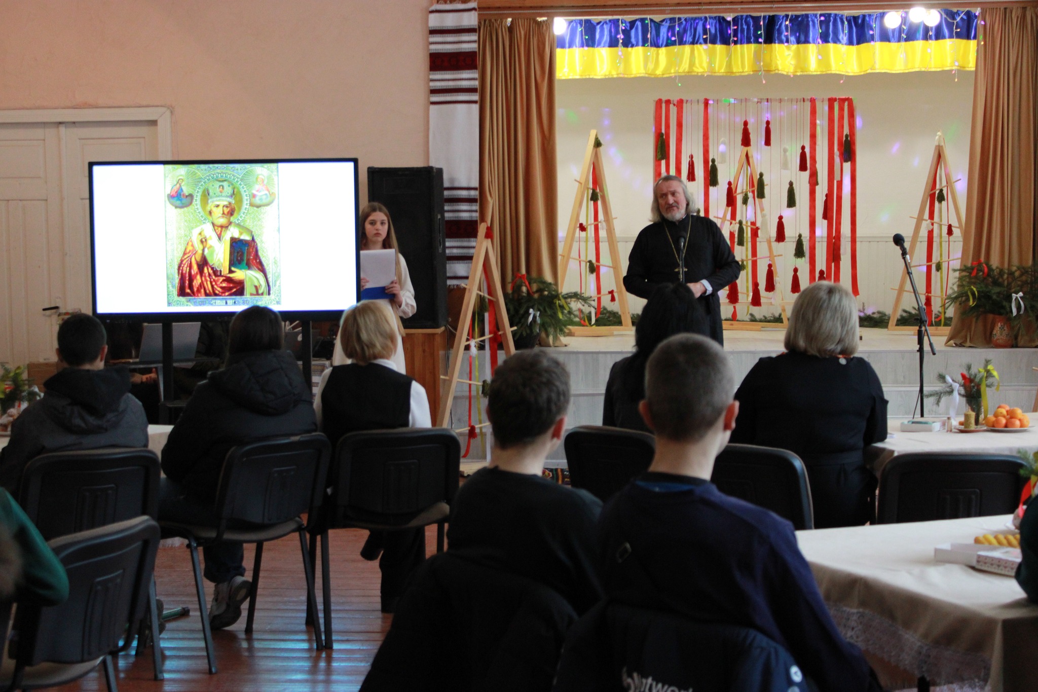 Розпочався захід із піднесення молитви до святого Миколая за нашу рідну Україну та за наших захисників. Настоятель Храму Різдва Пресвятої Богородиці отець Іван Рибарук подарував присутнім діткам іконки Криворівнянської Божої Матері Втілення Творчих Задумів та книгу Параски Плитки-Горицвіт «Різдв’єна коліда у селі Криворівня».