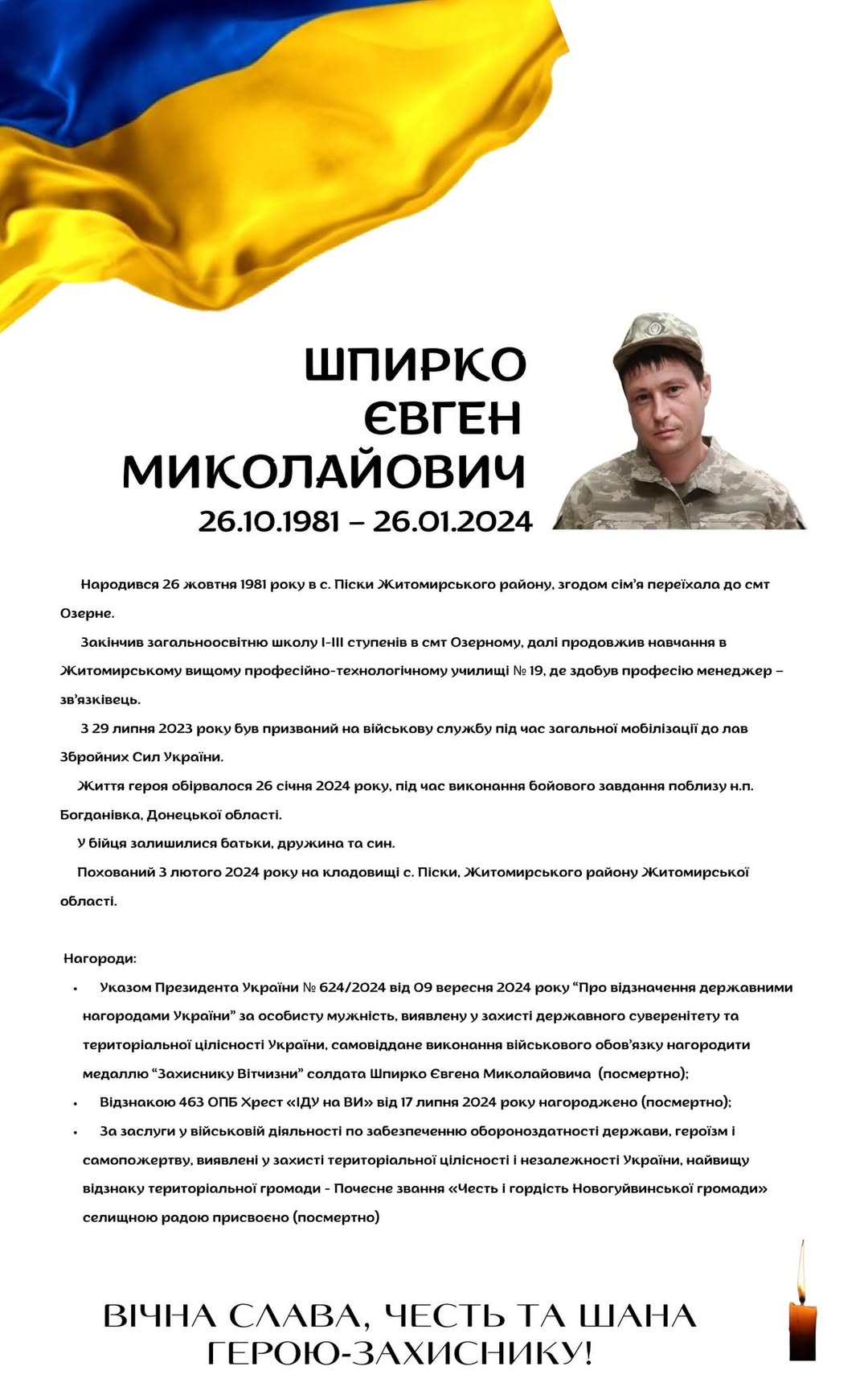 🇺🇦 Минає друга річниця, як загинув 🕯️ Шпирко Євген Миколайович, 26.10.1981-26.01.2024