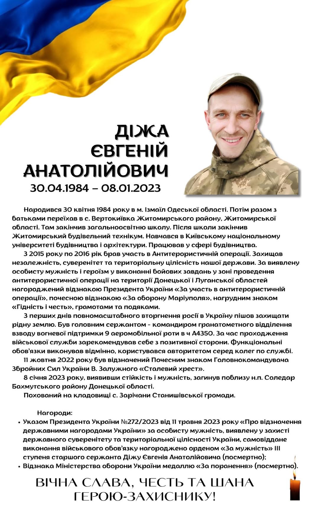 🇺🇦 Минає третя річниця, як загинув 🕯️ Діжа Євгеній Анатолійович 30.04.1984-08.01.2023