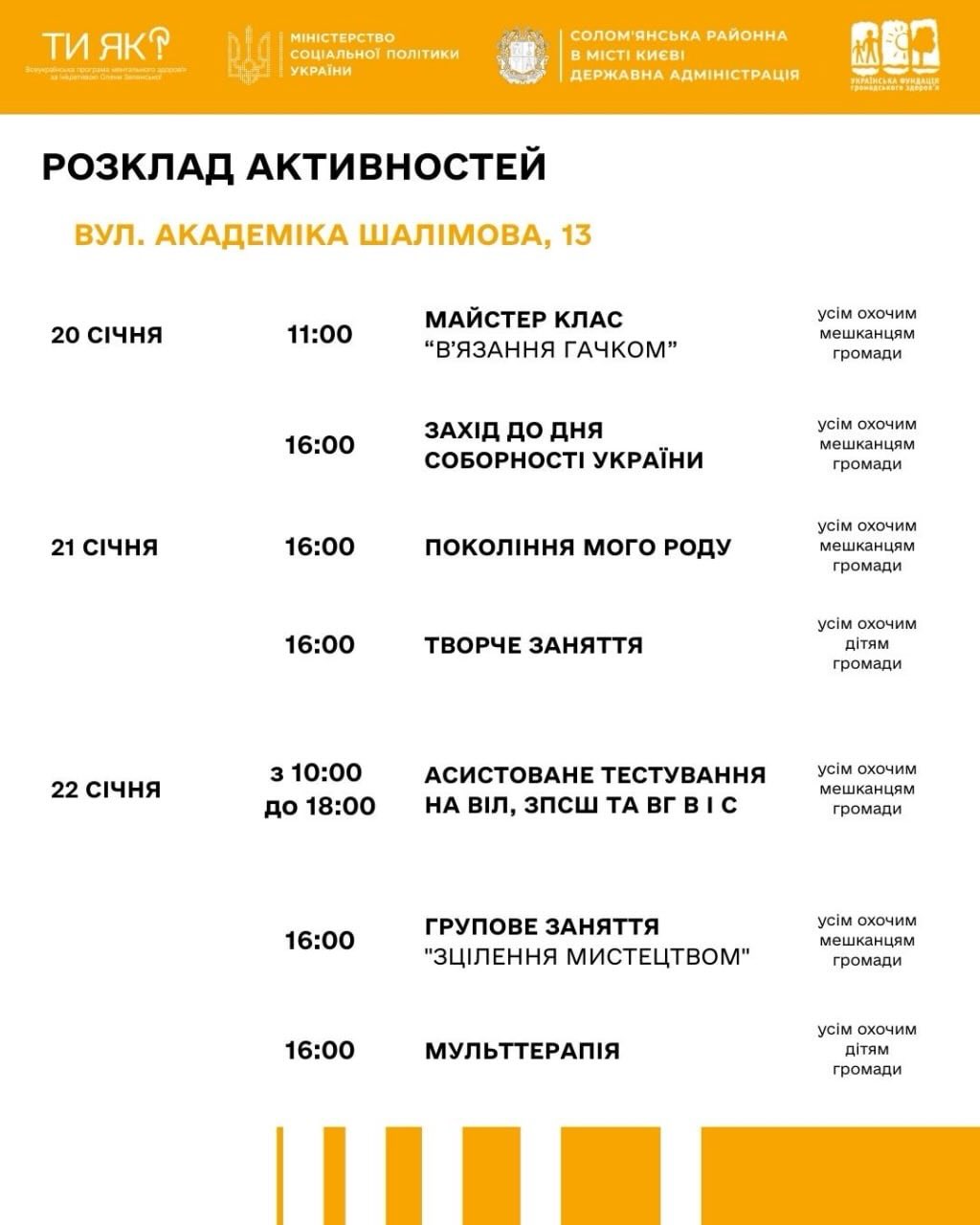 ❤️ Центр Життєстійкості Солом’янського району м. Київ зібрав для вас графік наших зустрічей на цей тиждень.