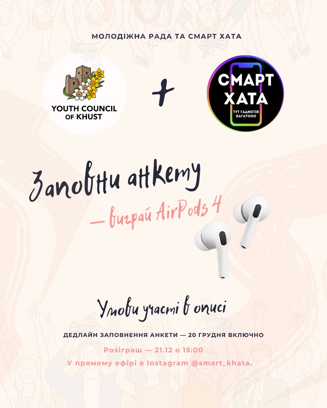 Молодь Хустської міської ТГ (14-35 років), зараз у вас є шанс і бути почутими, і стати власниками AirPods 4 😏🎧