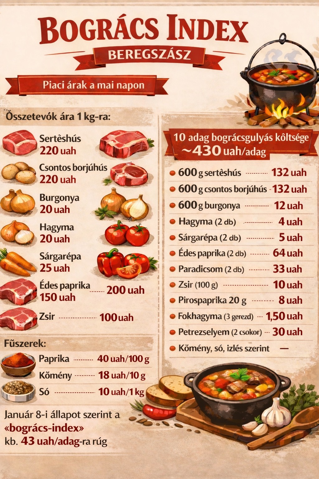 📌A január 8-i adatok szerint 10 adag (5 liter) házi bográcsgulyás elkészítése hozzávetőlegesen 430 hrivnyába kerül. Ez azt jelenti, hogy a „bográcsindex” körülbelül 43 hrivnya adagonként.