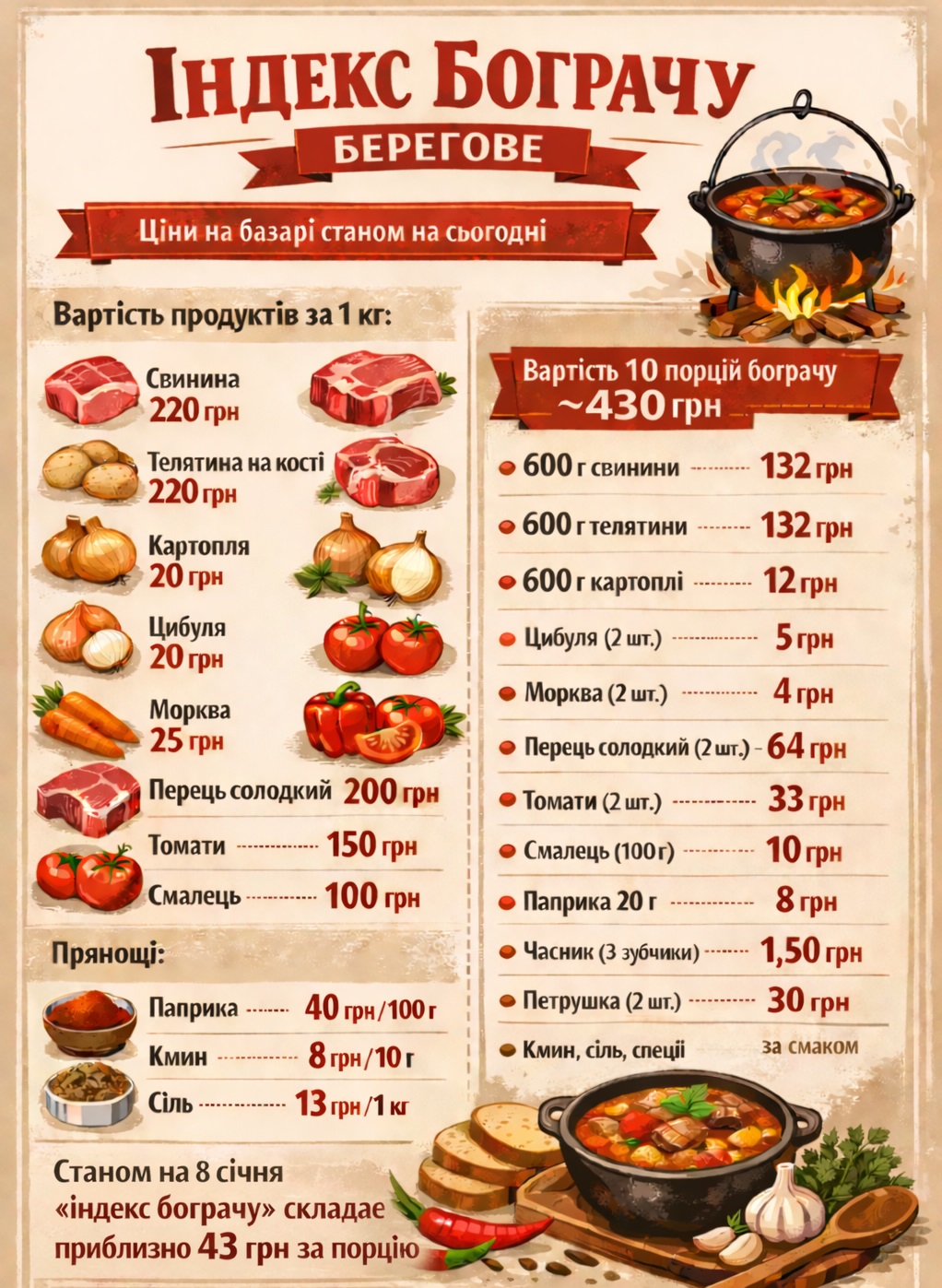 📌Станом на 8 січня, якщо готувати вдома 10 порцій (5 літрів) бограчу, це обійдеться приблизно у 430 грн. Тобто «індекс бограчу» становить близько 43 грн за порцію.
