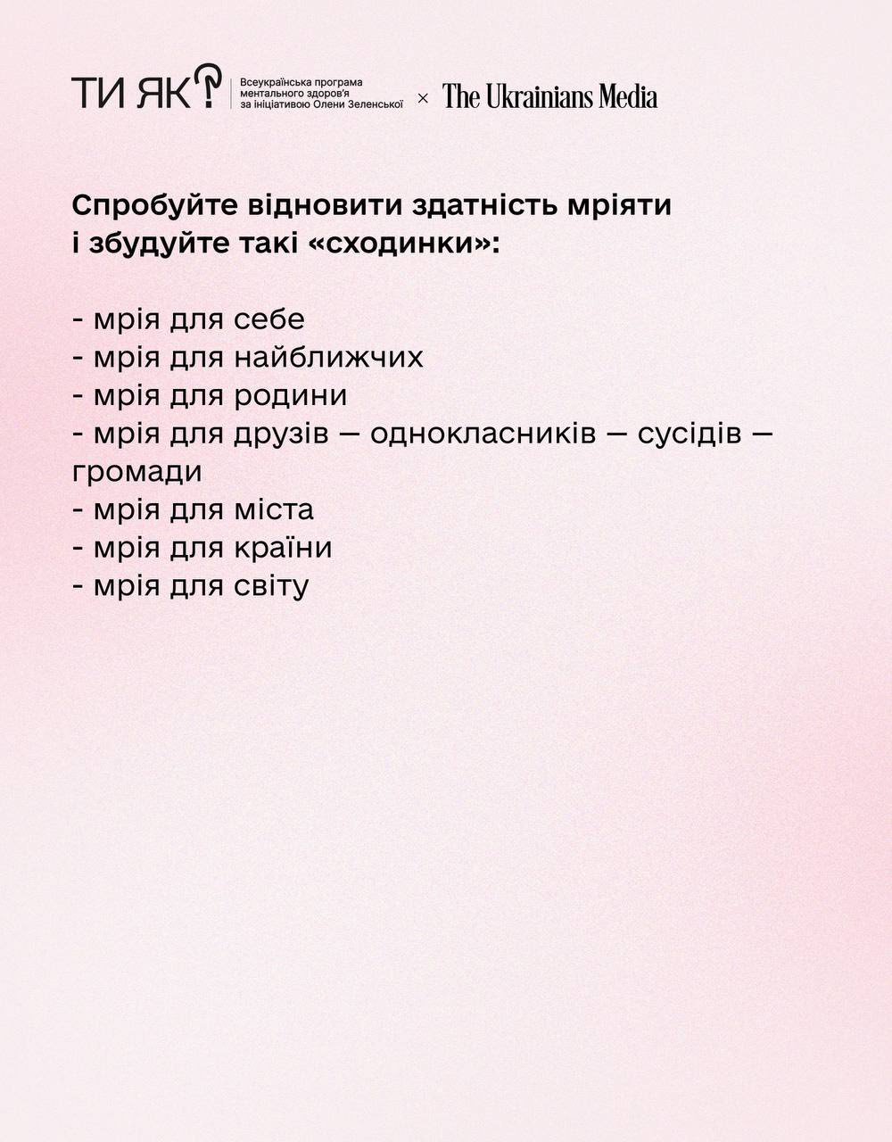The Ukrainians Media разом з психологинею Світланою Ройз, в рамках Всеукраїнської програми ментального здоров’я «Ти як?» за ініціативою Олена Зеленська, розповідають про те, чому мріяти зараз важливо і чому нормально, якщо тобі складно це робити 👇