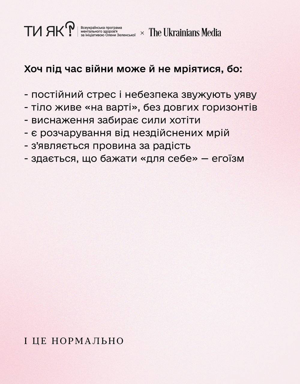 The Ukrainians Media разом з психологинею Світланою Ройз, в рамках Всеукраїнської програми ментального здоров’я «Ти як?» за ініціативою Олена Зеленська, розповідають про те, чому мріяти зараз важливо і чому нормально, якщо тобі складно це робити 👇
