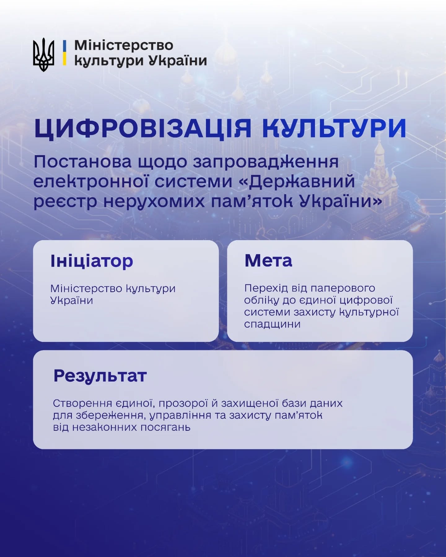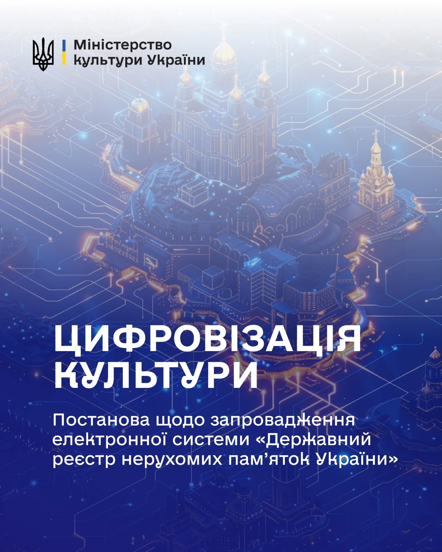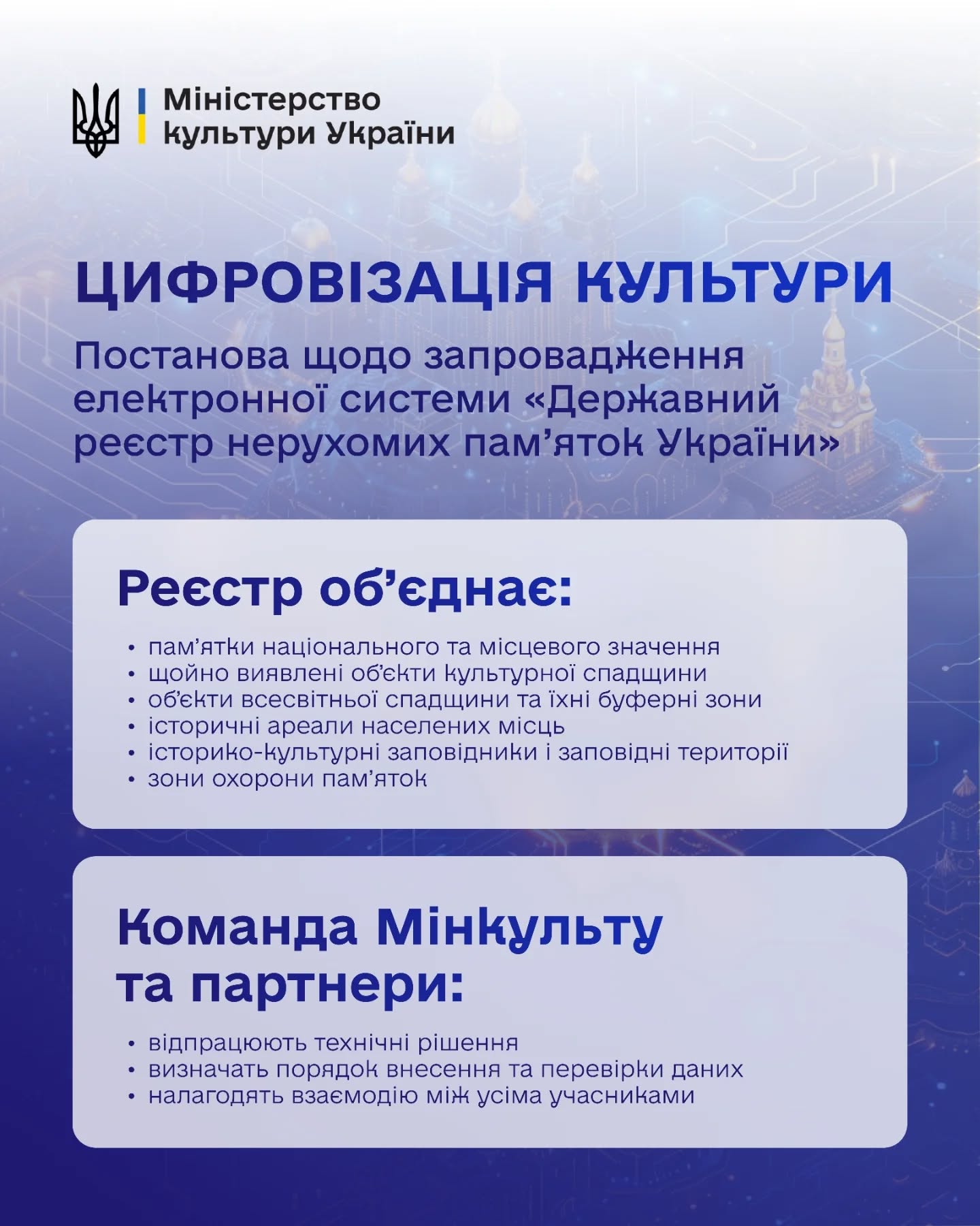 28 січня Кабінет Міністрів України ухвалив ініційовану Міністерством культури України постанову про запуск експериментального проєкту зі створення електронної системи «Державний реєстр нерухомих пам’яток України».