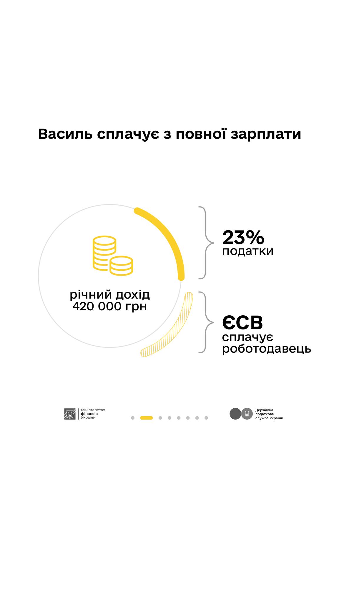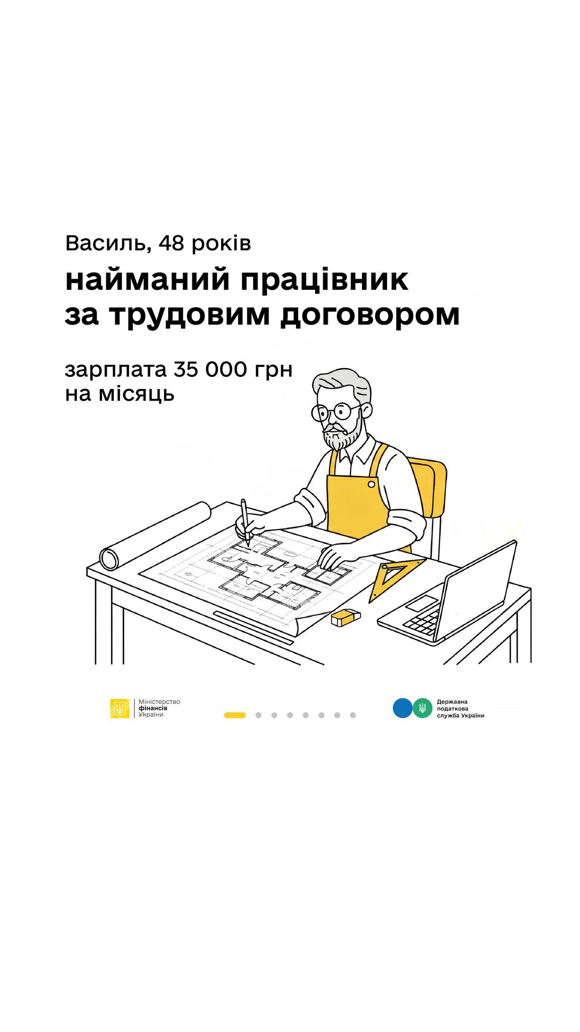 Уявіть Василя. В свої 48 років він працює в будівельній компанії архітектором. Василь працевлаштований офіційно, за трудовим договором і сплачує податки з повної, «білої» заробітної плати. Його щомісячний дохід до вирахування податків – 35 000 грн (105 тис. грн/квартал, 420 тис. грн/рік). Після відрахування податків на руки він отримує 26 950 грн.
