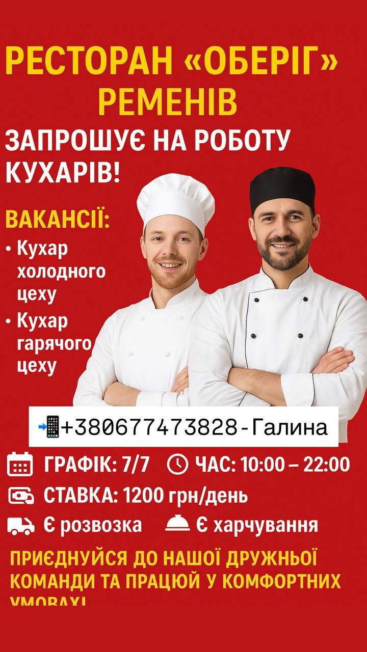 Ресторан «Оберіг» (с. Ременів) запрошує до своєї команди кухарів.