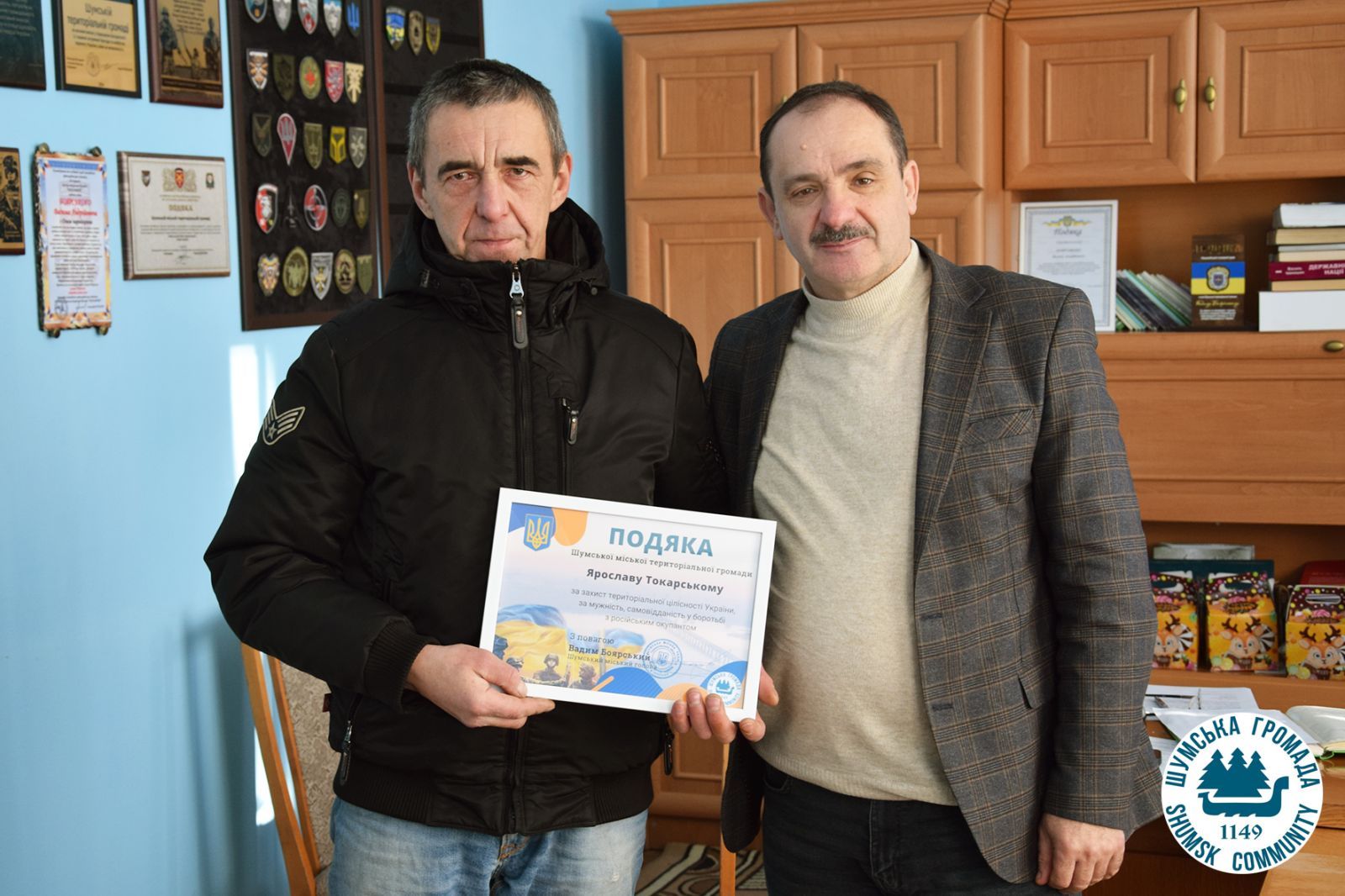 Міський голова Вадим Боярський зустрівся з військовослужбовцем Збройних Сил України Ярославом Токарським. Від імені всієї Шумської громади висловив щиру вдячність воїну за мужність, патріотизм та самовідданий захист рідної землі. Житель села Рохманів у 2022 році став на захист України. Військовослужбовець проходить службу у складі мобільної вогневої групи.