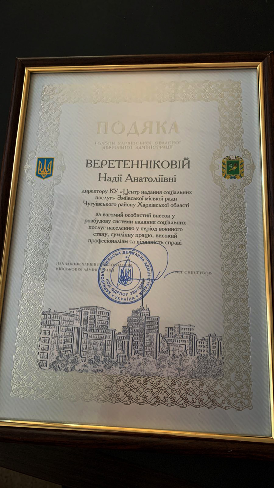 Директор Комунальної установи «Центр надання соціальних послуг» Зміївської міської ради Надія Анатоліївна Веретеннікова нагороджена Подякою голови Харківської обласної військової адміністрації.