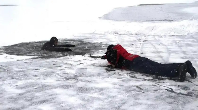 ⚫ витягаючи потерпілого, попросіть його працювати ногами – так буде легше витягнути його з ополонки. Коли ви його витягли, не дозволяйте йому підійматися на ноги, нехай він повзе вслід за вами до берега;