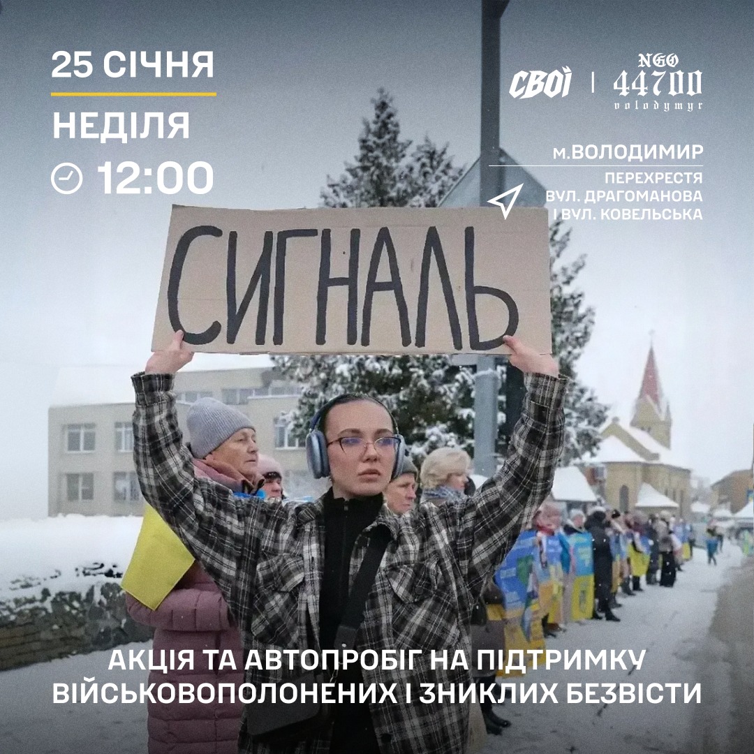 🇺🇦 25 січня у Володимирі відбудеться мирна акція на підтримку військовополонених та зниклих безвісти Захисників.