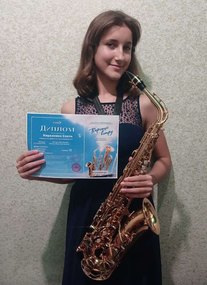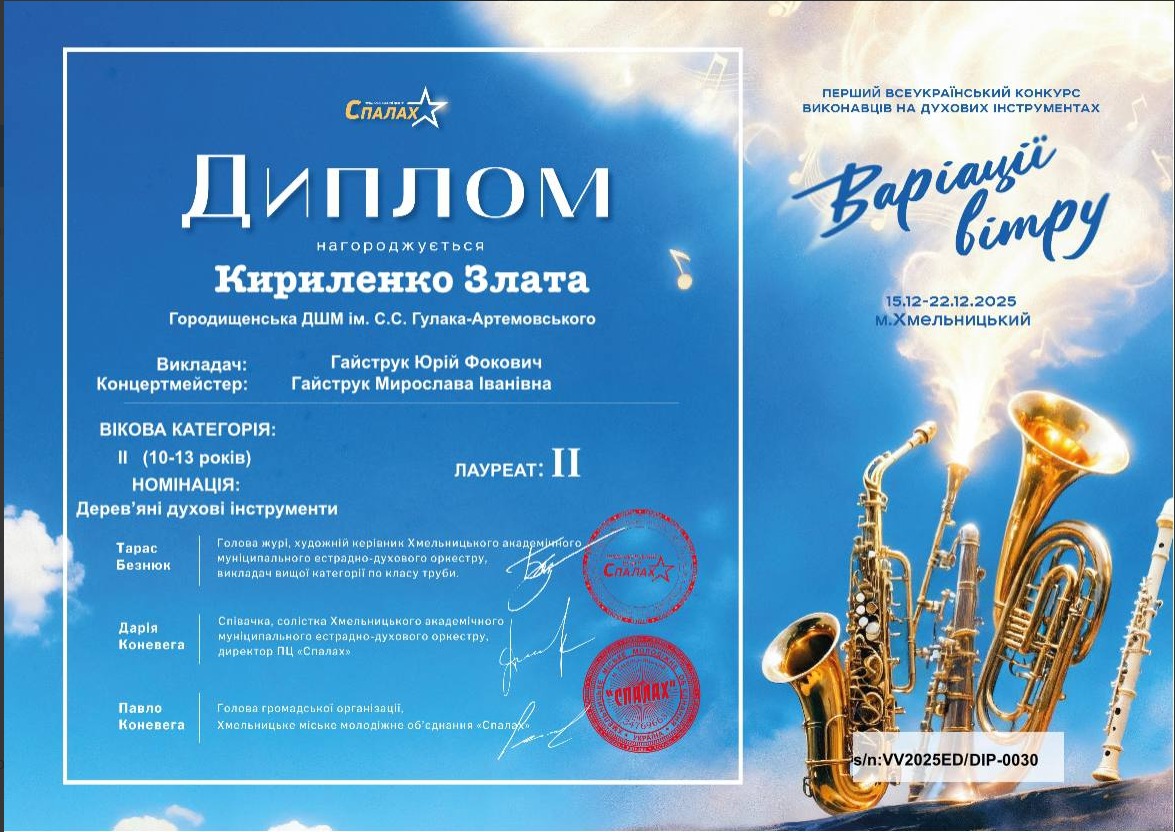 🌟 Злата здобула почесне ІІ МІСЦЕ у Першому Всеукраїнському конкурсі виконавців на духових інструментах «ВАРІАЦІЇ ВІТРУ – 2025» (номінація «Дерев’яні духові інструменти — саксофон»),