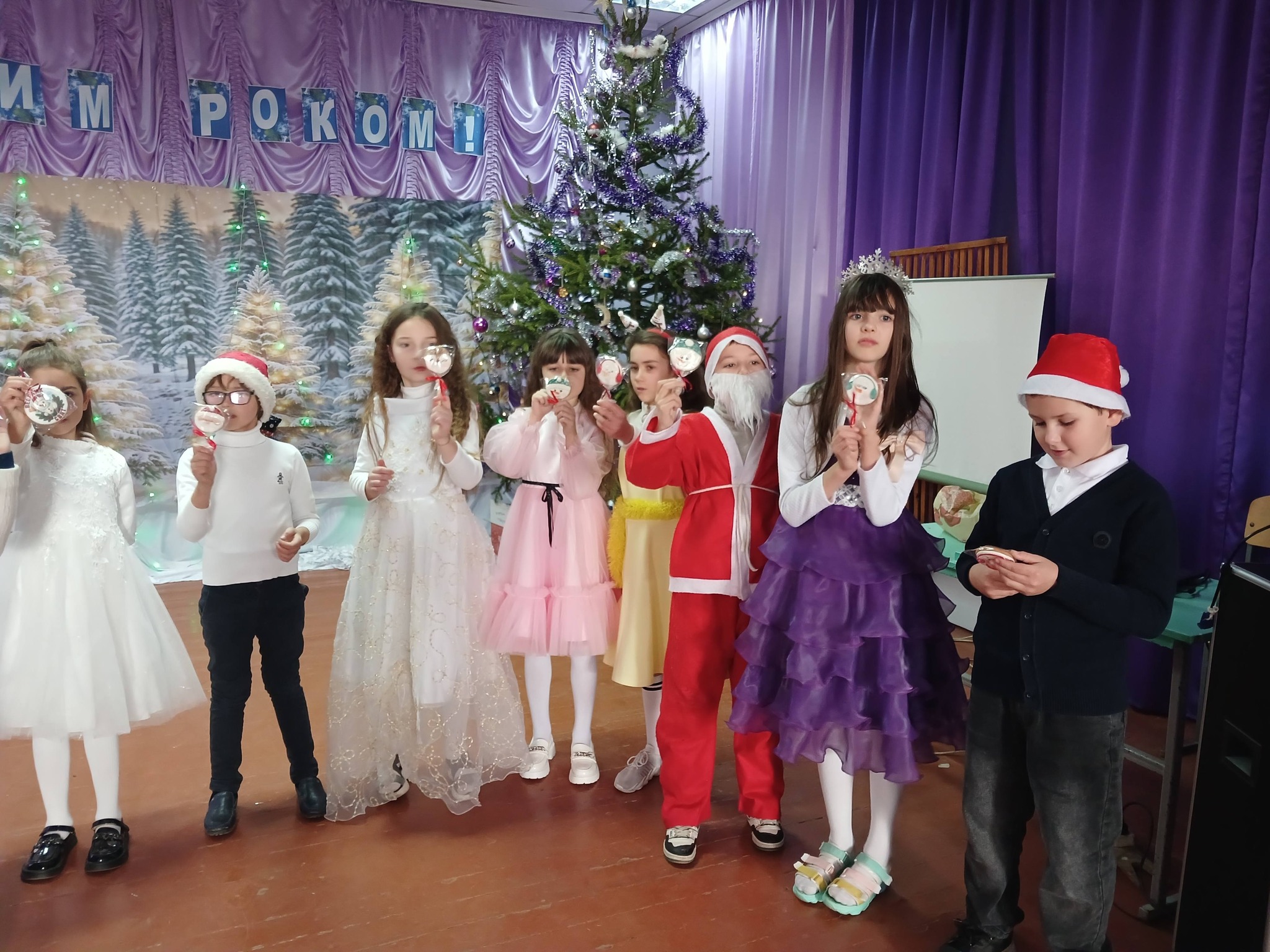 Діти показували цікаві інсценівки, співали пісні, кружляли у таночку, отримали солодкі подарунки. В гості до першокласників завітали Дід Мороз (президент гімназії – Тюлю Я.) та Снігуронька ( омбутсман гімназії – Карайван М.) та наприкінці свята провели безпрограшну лотерею для дітей: учні 1-4 класів вибирали по одному імбирному новорічному печиву , а учні 5-6 класів новорічні льодяники з побажаннями та призами. Діти раділи, їхні очі світилися щастям і відчувалася справжня атмосфера чудового свята. Свято закінчилося фотосесію.