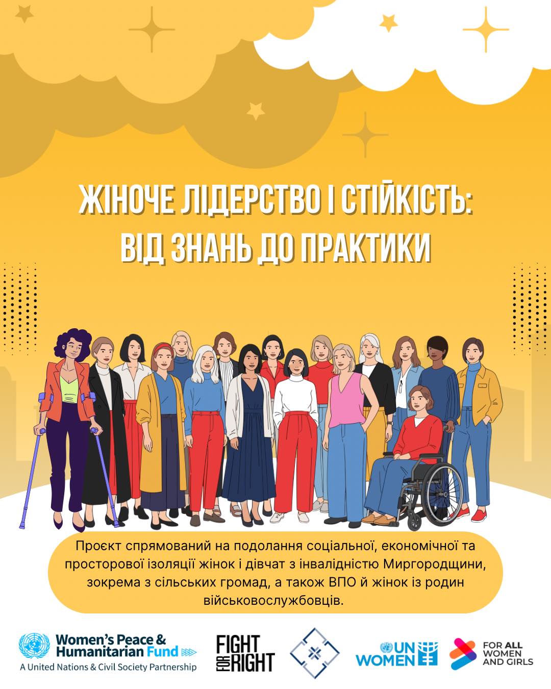 Навчальний модуль «Жіноче лідерство і стійкість: від знань до практики» створено ГО «Рідний край — Гадяччина» у межах проєкту «Лідерство жінок з інвалідністю в громадах», який реалізовується ГО Fight For Right за технічної підтримки ООН Жінки в Україні та за фінансування Жіночого фонду миру та гуманітарної допомоги ООН (WPHF). Проте це не означає, що висловлені під час воркшопів (тренінгів, конференцій)погляди та вміст є офіційно схваленими або визнаними з боку Організації Об’єднаних Націй. Жіночий фонд миру та гуманітарної допомоги ООН (WPHF) – гнучкий та оперативний інструмент фінансування, що підтримує якісні заходи для підвищення спроможності місцевих жінок у запобіганні конфліктам, реагуванні на кризи та надзвичайні ситуації та використання ключових можливостей миробудівництва.