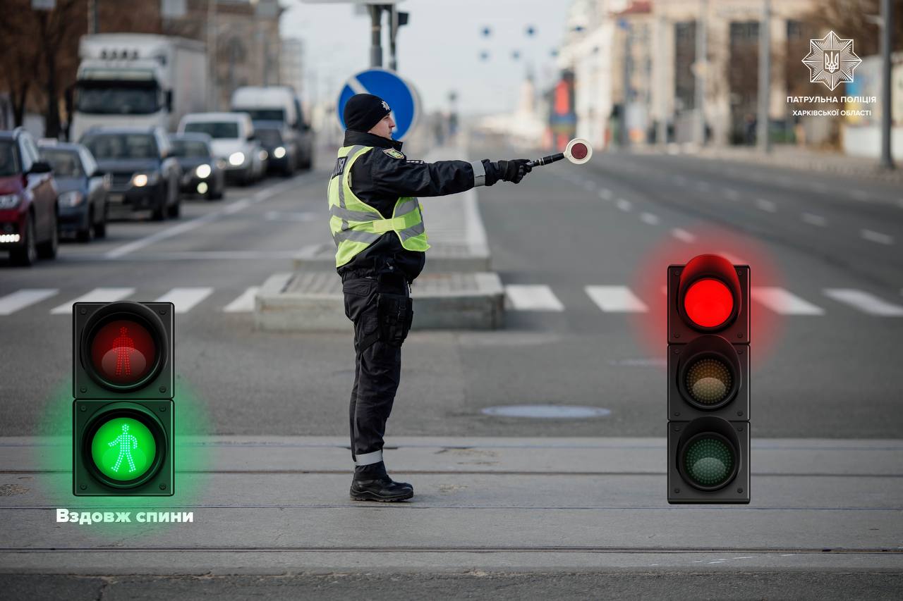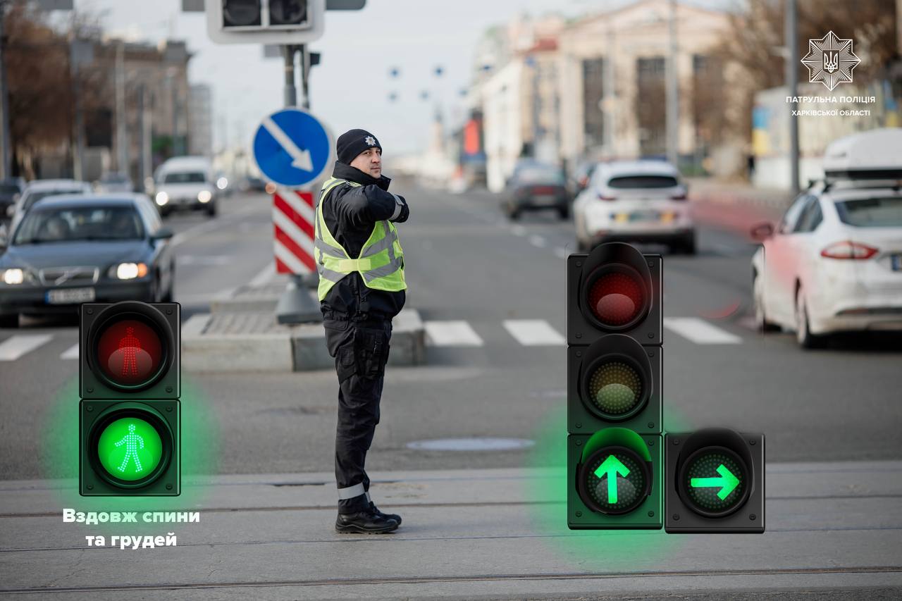 ✅ пішоходи мають право переходити проїзну частину як за спиною, так і перед грудьми регулювальника;