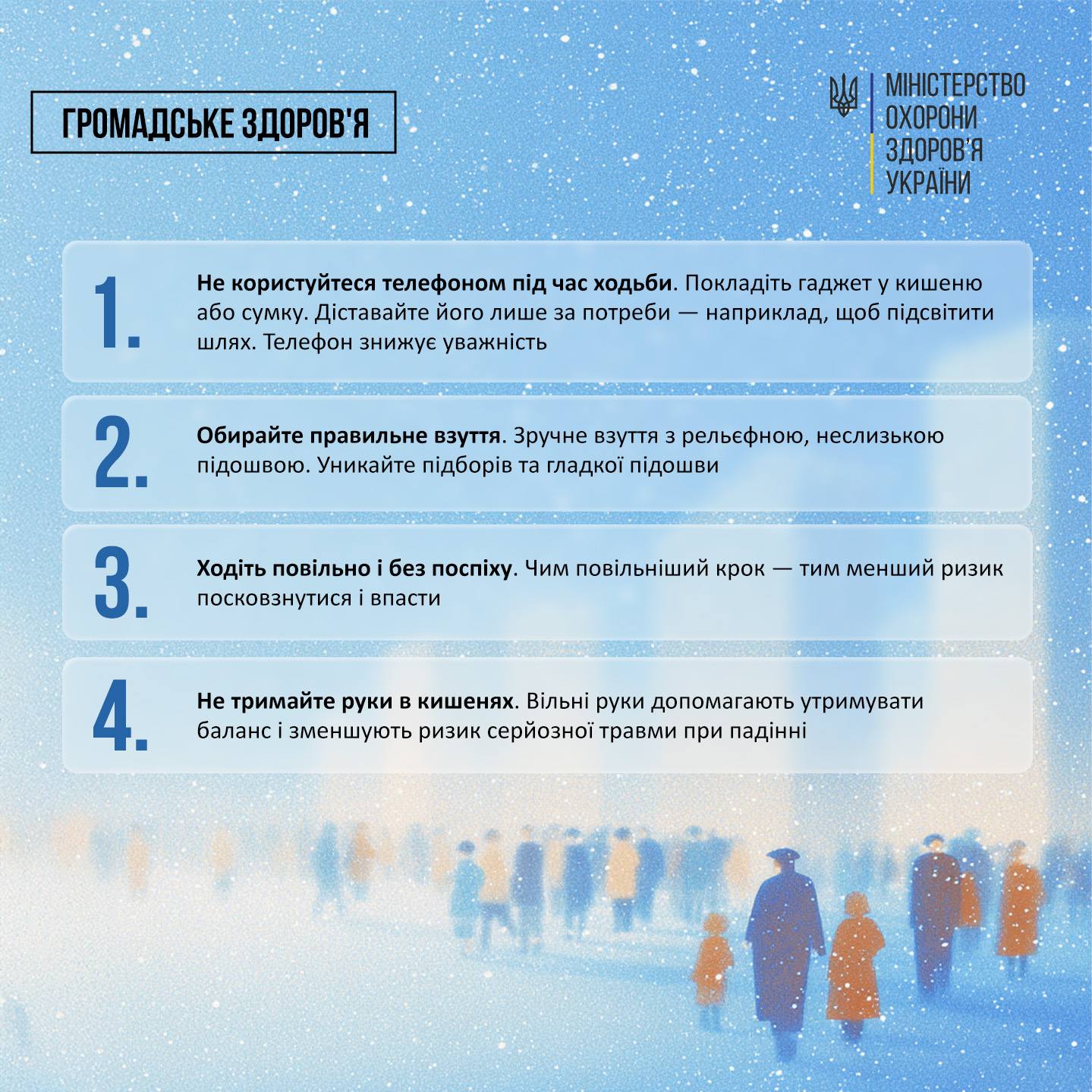 У Центр громадського здоров’я України кажуть: перш за все необхідно оцінити свій стан. У разі удару голови або підозри на перелом — одразу телефонуйте 103 або 112.