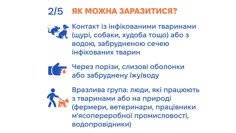 Найчастіше резервуаром збудника лептоспірозу в Україні є сірі щурі та польові миші. Також переносниками інфекції можуть бути бабаки, собаки, велика рогата худоба, свині та коні. Лептоспіроз передається через укус гризуна, травмовану шкіру (порізи), слизові оболонки або під час споживання забруднених сечею інфікованих тварин їжі (молоко, м’ясо) чи води, купання, риболовлі, догляду за хворими тваринами.