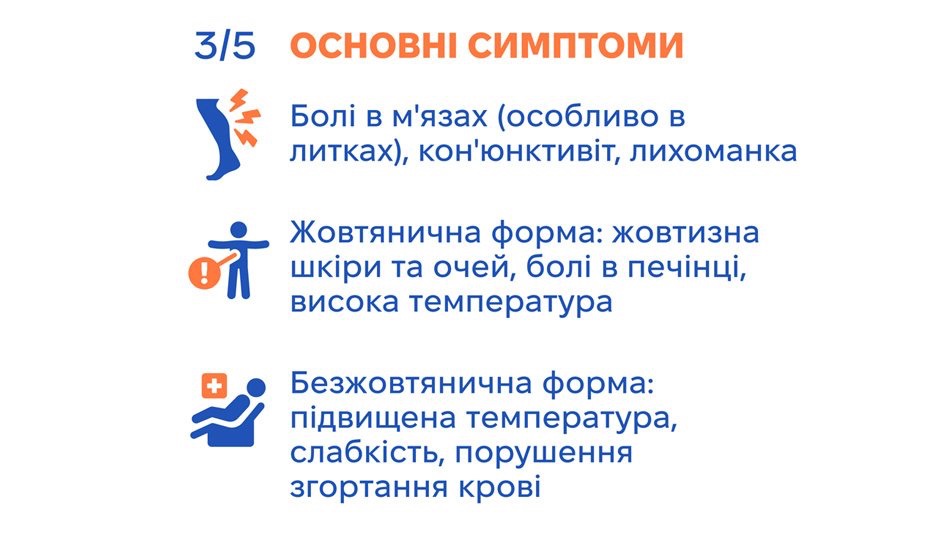 Збудник лептоспірозу передається контактним шляхом через слизові оболонки та шкірні покриви. За симптомів лептоспірозу потрібно негайно звернутися до сімейного лікаря, щоб як найраніше почати специфічне бактеріальне лікування — інакше сильно зростають шанси розвитку тяжких ускладнень. Додаткова небезпека лептоспірозу криється у тому, що 90% випадків починається з неспецифічних симптомів, таких як температура 39–40°C та почервоніння очей. Але є і більш характерна симптоматика: