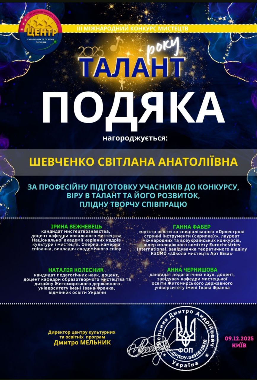 Наприкінці 2025 року в столиці України — місті Києві — відбувся третій Міжнародний конкурс мистецтв «Талант року – 2025».