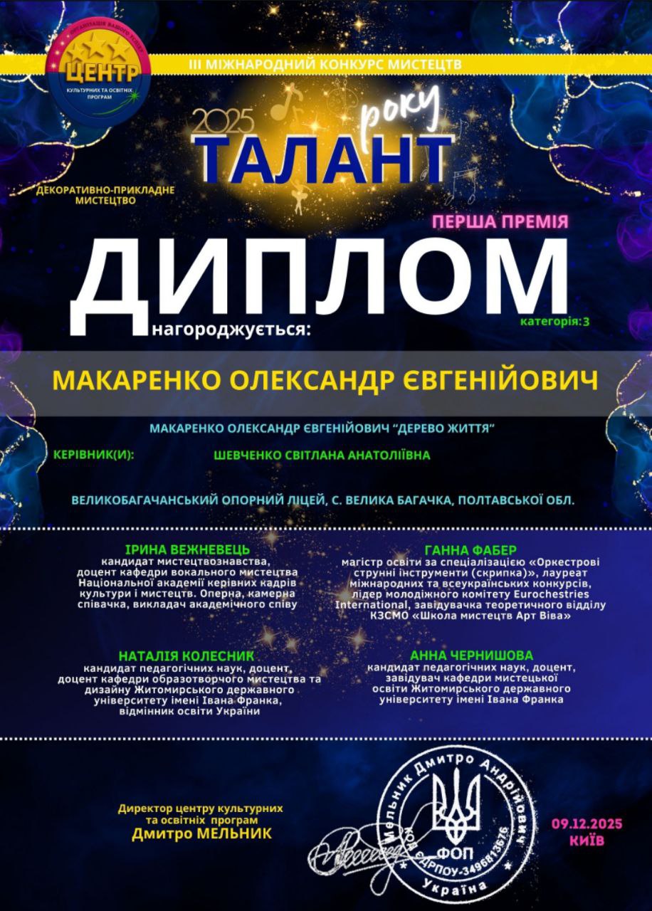 Здобувач освіти Великобагачанського опорного ліцею Олександр Макаренко (учитель технологій Світлана Шевченко) гідно представив свій навчальний заклад та показав високий рівень професійної підготовки у номінації декоративно-прикладне мистецтво. Його творча робота вирізнялася оригінальністю задуму, майстерністю виконання та естетичною довершеністю.