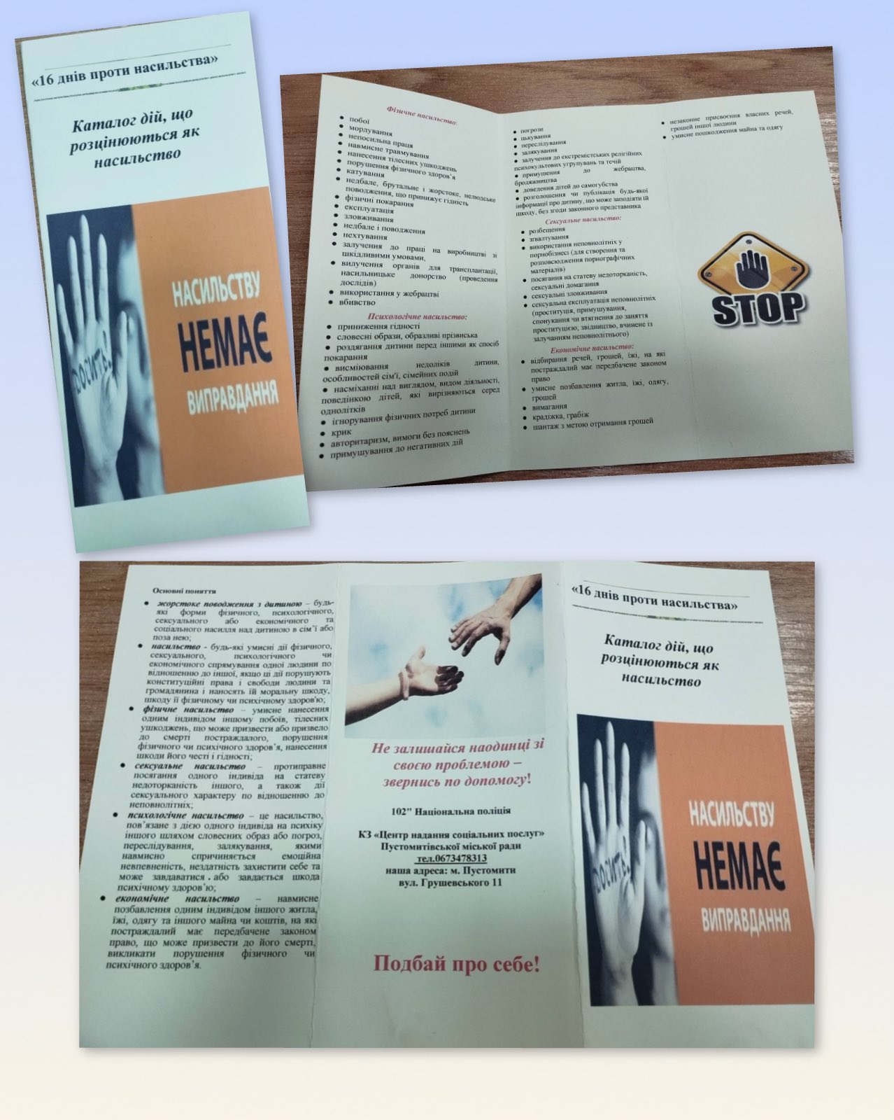 📋КЗ Центр надання соціальних послуг також розроблено інформаційні буклети «Насильству немає виправдання», в яких кожен мешканець громади може отримати комплексні знання та інструменти для реагування на проблему насильства, дізнатися про види та ознаки насильства, а також отримати контакти служб, які надають допомогу.