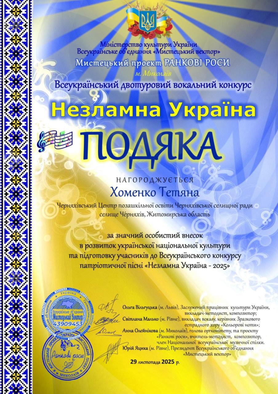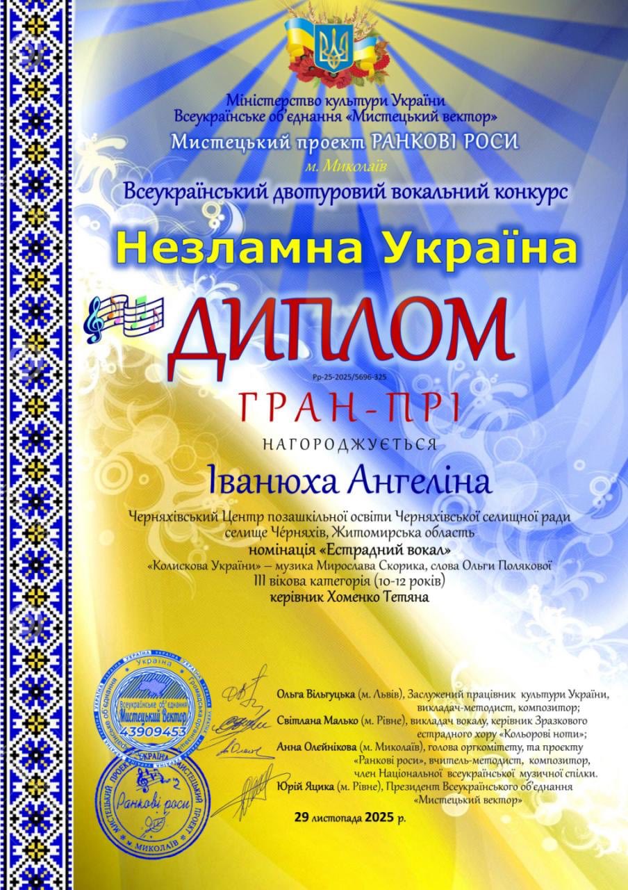 Гарною перемогою у Всеукраїнському двотуровому вокальному конкурсі «Незламна Україна»(ГРАН-ПРІ) розпочався Новий рік для солістки студії вокального співу «ТІП-ТОП» Центру позашкільної освіти Черняхівської селищної ради Ангеліни Іванюхи та її керівника Тетяни Хоменко.