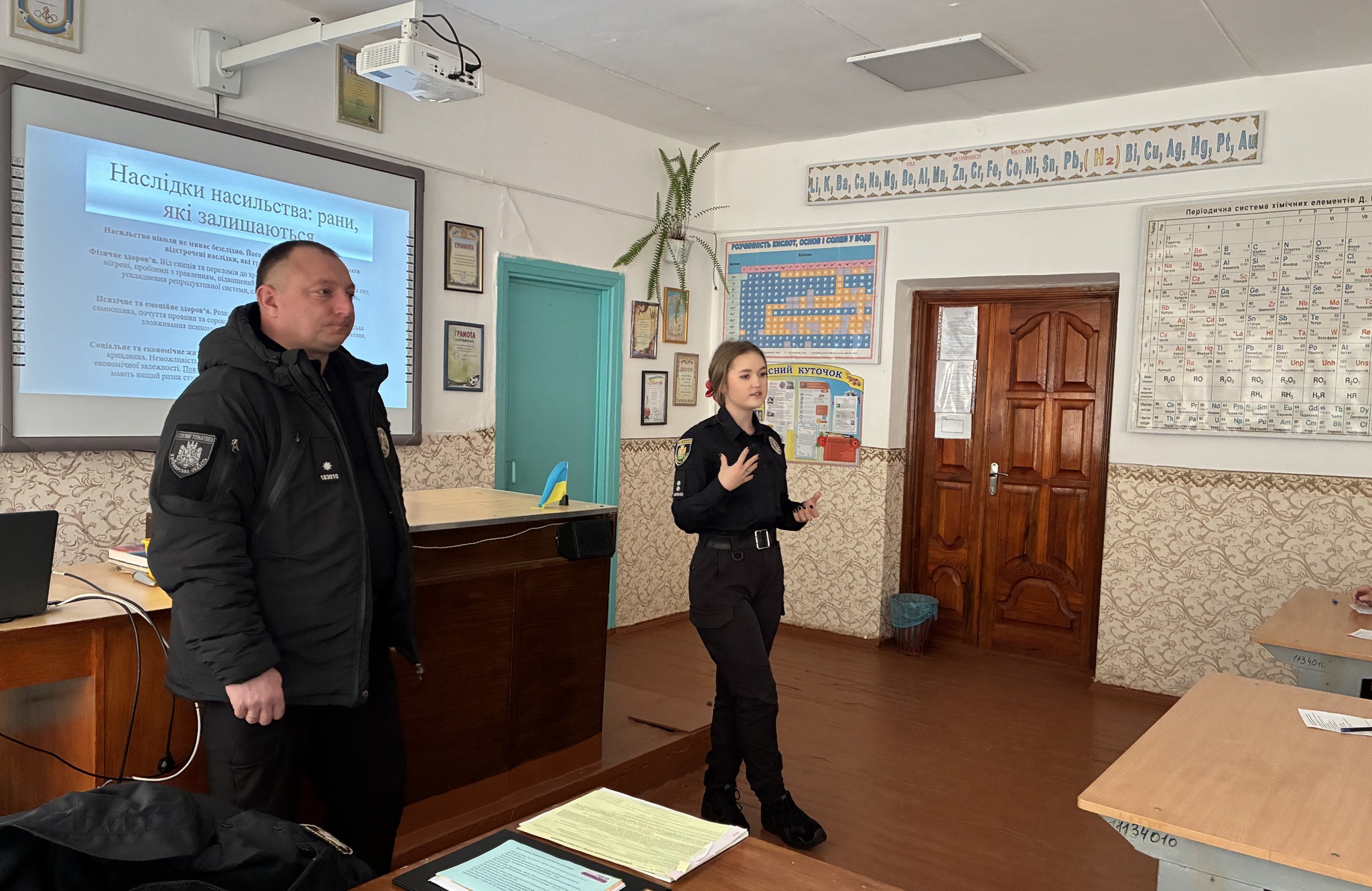 Також участь у заході взяв поліцейський офіцер громади Трубій С. В., який підкреслив роль громади у запобіганні насильству, пояснив механізми взаємодії правоохоронних органів зі школою та родинами, а також заохотив учнів не боятися звертатися по допомогу, якщо вони стали свідками чи учасниками небезпечних ситуацій.