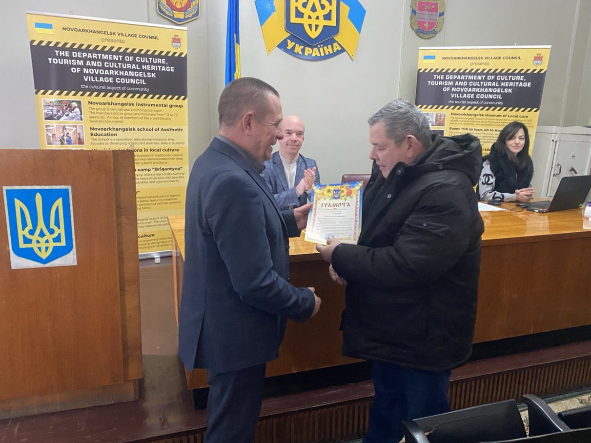 Далі селищний голова Юрій Павлович ШАМАНОВСЬКИЙ вручив депутату селищної ради Павлу Анатолійовичу Буднику грамоту Новоархангельської селищної ради з нагоди Дня місцевого самоврядування і подякував за плідну діяльність на благо громади.