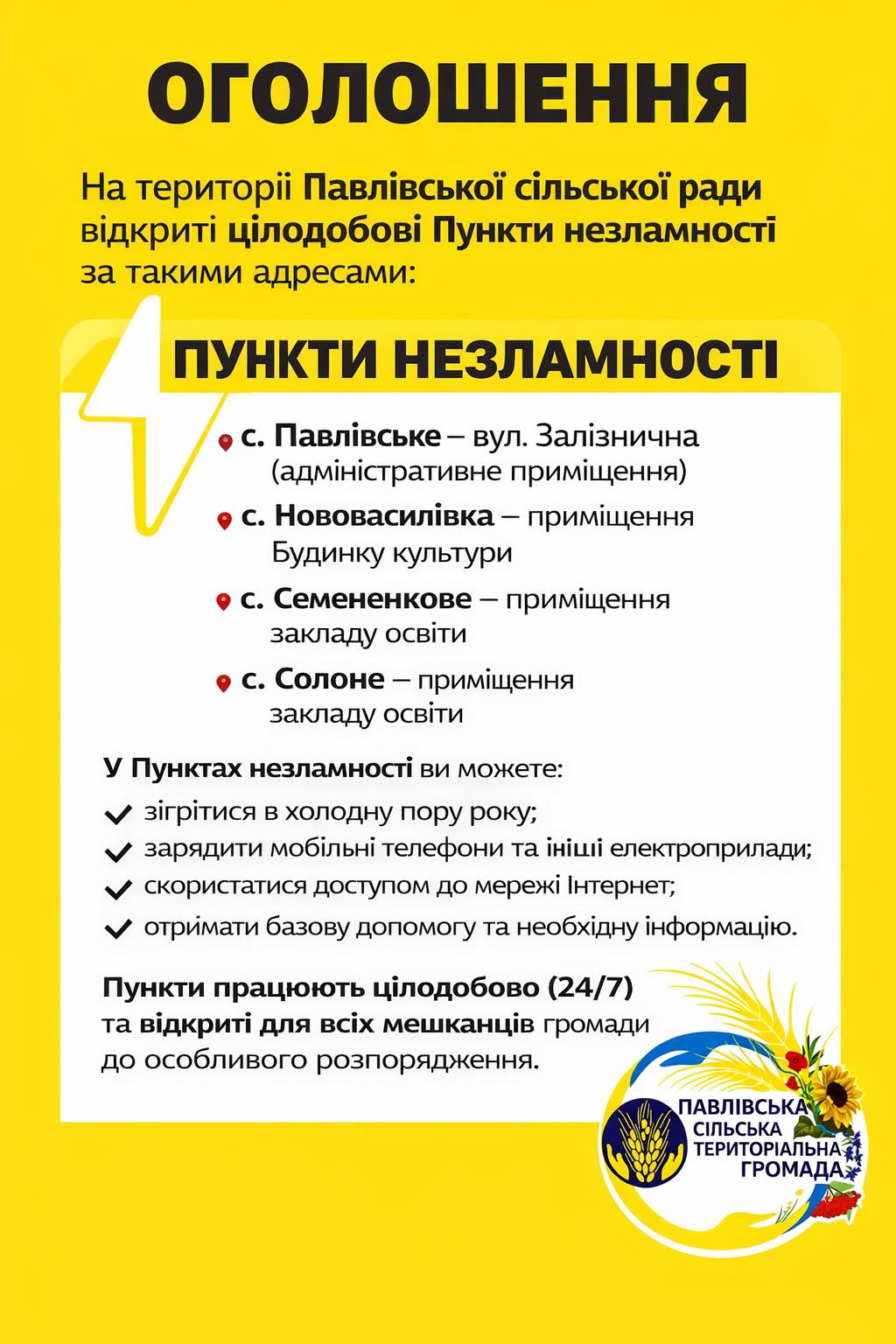 На території Павлівської сільської ради відкриті цілодобові Пункти незламності за такими адресами:
