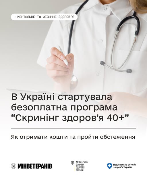 А ще більше про Скринінг здоров’я 40+ та відповіді на поширені запитання — тут: https://screening.moz.gov.ua