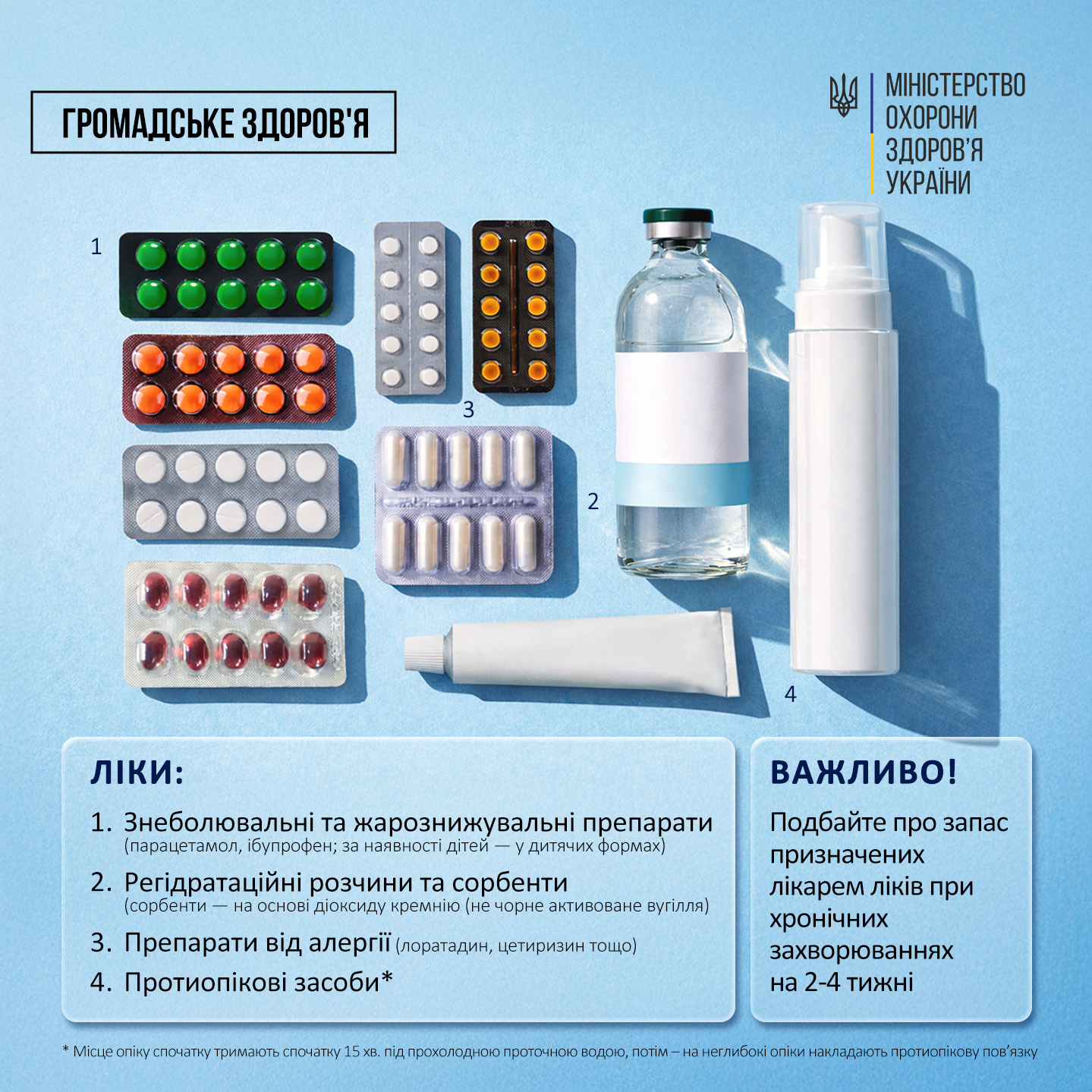 👉 Формуючи домашню аптечку, зважайте на власний стан здоров’я та потреби родини. Якщо хтось із близьких має хронічні захворювання, обов’язково додайте до аптечки препарати, які приймаєте регулярно (рецептурні або безрецептурні).